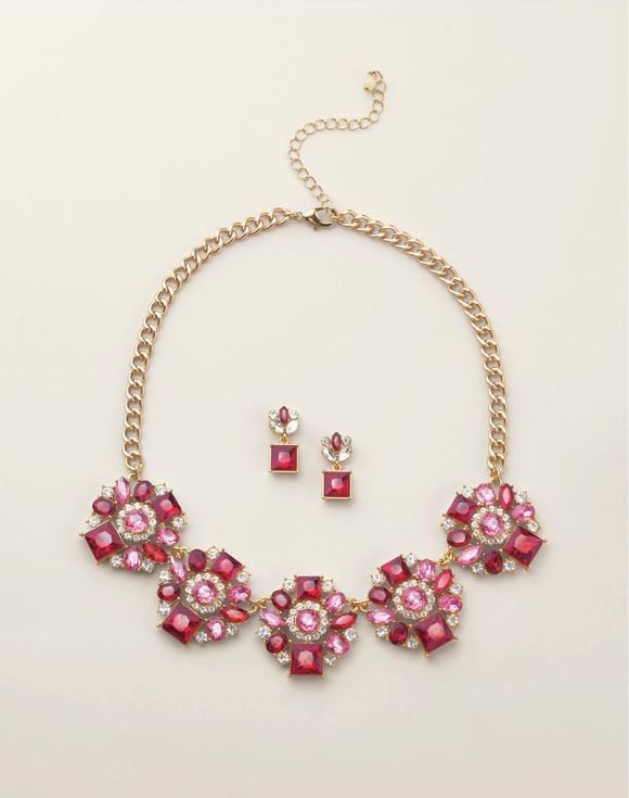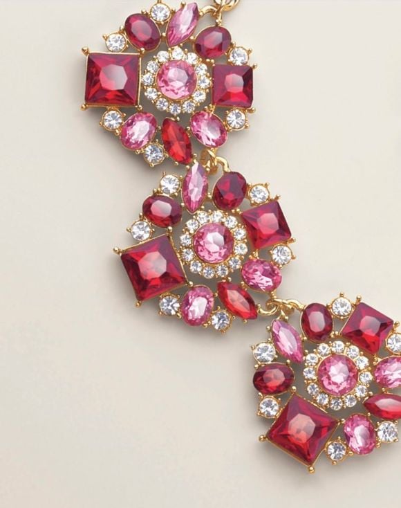 Shine bright at any celebration with crimson radiance. Pink and ruby-like faceted stones are artfully arranged in floral-inspired designs, accented with sparkling clear stones for maximum glamour.