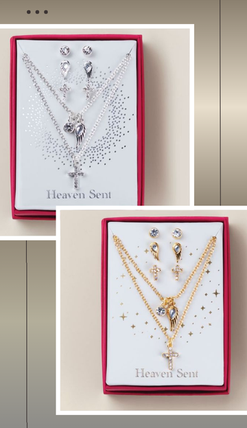 A meaningful gift of faith and beauty. This ready-to-gift set includes two necklaces and three pairs of sparkling stud earrings with clear stone accents. With elegant details and symbolic touches, it’s a thoughtful way to share love, light and inspiration.