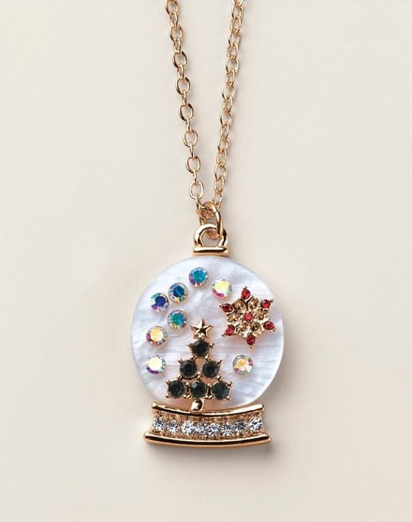 Give a Christmas keepsake to treasure for years to come. This festive necklace features a classic goldtone chain with your choice of sparkling holiday-inspired pendants: stocking and snow globe.