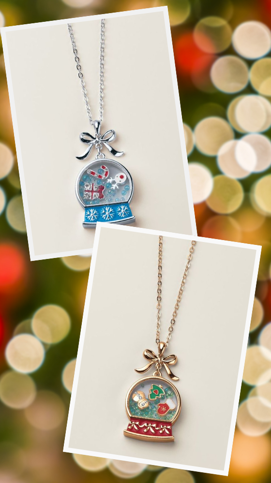A whimsical necklace that’s bursting with festive cheer, featuring a snow globe-inspired pendant adorned with colorful floating stones, enamel charms and all the magic of a winter wonderland. It's a joyful statement piece that brings instant sparkle to sweaters, dresses—or even your coziest PJ look. Available in two styles: Ribbon/Red or Snowflake/Blue.