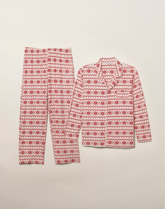 Get festive and cozy in a cheerful two-piece pajama set, featuring a classic Fair Isle print that’s merry and bright. Its soft, stretchy fabric makes this set perfect for lounging, gifting—or both! Center back length: 26 ½" on M; 28" on 1X. Inseam: 29" on all sizes.