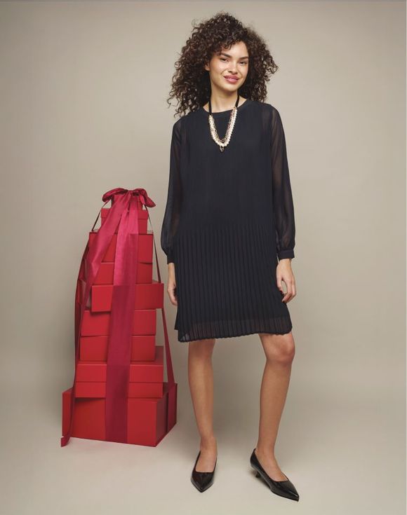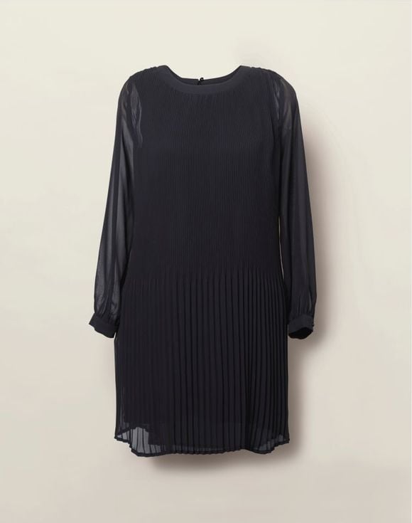 A versatile LBD fit for the office, special occasions and beyond. Designed with a round neckline, long sleeves and a delicate button-and-keyhole detail at the back, this pleated style flows beautifully with every step. Imported.
