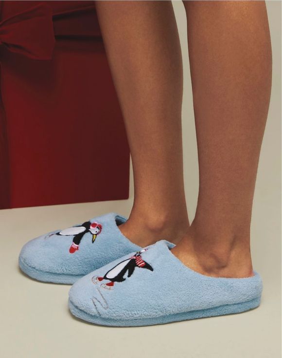 Slide into seasonal fun with cozy slippers featuring charming, embroidered skating penguin motifs. These ice-blue slippers are lined with plush warmth from heel to toe, keeping your feet cozy on chilly days. Imported.