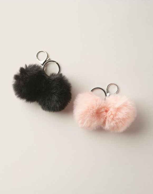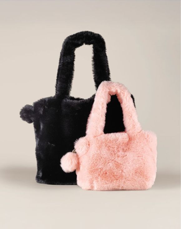 Blending high-fashion flair and everyday functionality, these faux-fur totes are spacious, soft and seriously cute. The two-pack includes large black and small pink totes. Both feature removable faux fur pom-pom key fobs. Imported.