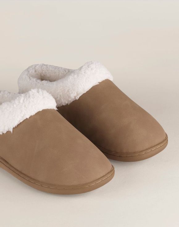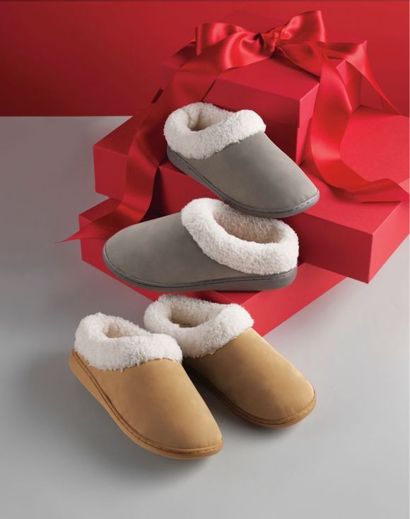 Comfort with every step. Suede-like mule slippers are lined with ultra-soft faux shearling to help toes stay warm and cozy, while the cushioned insole adds all-day comfort. Perfect for gifting—or keeping all to yourself! Available in Grey or Tan. Imported.