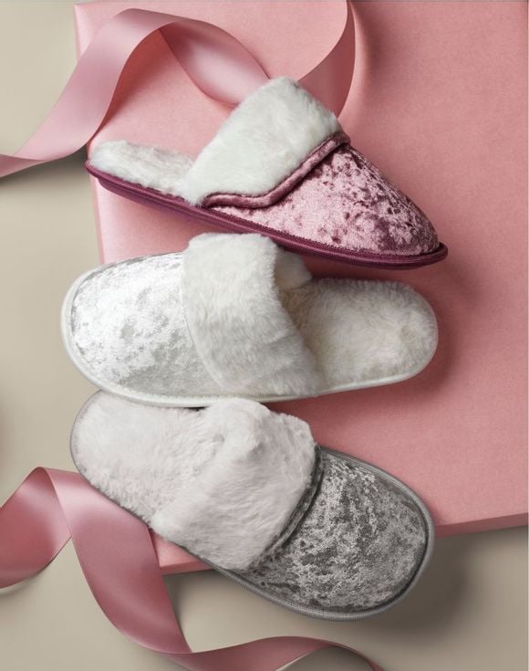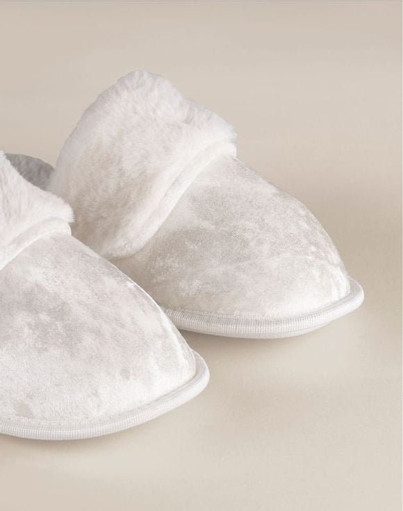 Indulge your feet in plush comfort with comfy yet stylish slippers. The smooth velvet exterior adds a luxe touch, while the ultra-soft faux fur lining provides all-day comfort. Available in three chic shades: Mauve, Ivory and grey. Imported.