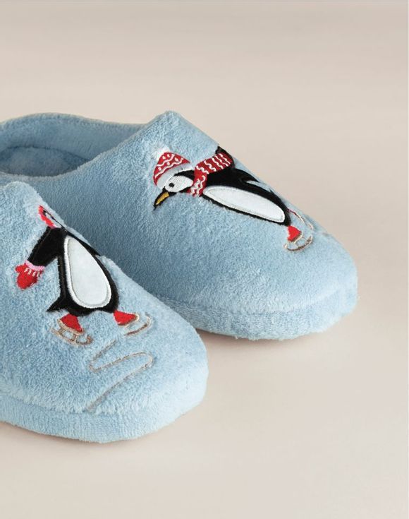 Slide into seasonal fun with cozy slippers featuring charming, embroidered skating penguin motifs. These ice-blue slippers are lined with plush warmth from heel to toe, keeping your feet cozy on chilly days. Imported.
