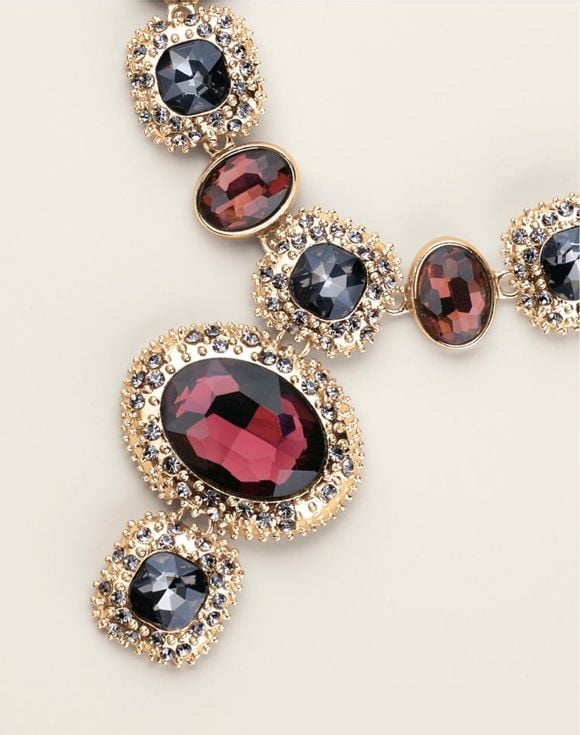 Make a statement with the luxe combination of gleaming gold and rich red hues. Featuring garnet-like and smoky grey faceted glass stones set in radiant goldtone, this stunning piece adds a touch of vintage-inspired glamour. Imported.