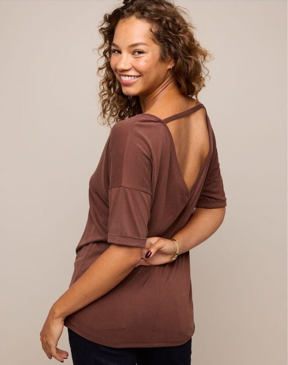 A V-neck basic with more! Features a flattering V-neckline in both the front and back. Perfect for dressing up your denim or layering under a blazer. The rich chocolate hue and soft ¾-length sleeves make this top a must-have staple. Center back length: 27" on M; 29" on 1X. Imported.