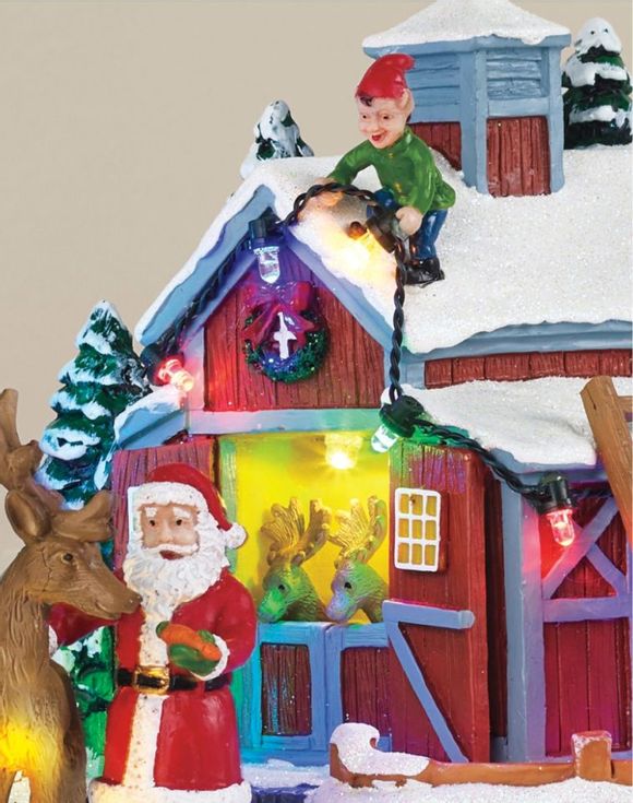 Take a spin with Santa around the reindeer barn! Tree and barn light up as Santa and his reindeer spin in front to everyone’s favorite holiday melodies. 8" W x 5 ½" D x 6 ¾" H. Imported.