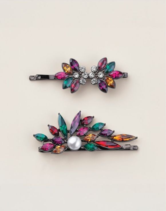 • Marquise-cut glass stones with the look of amethyst, amber and emerald