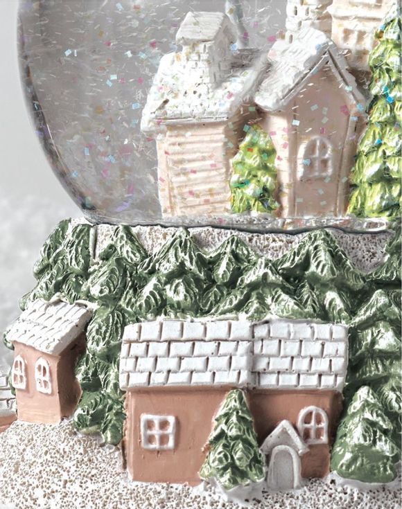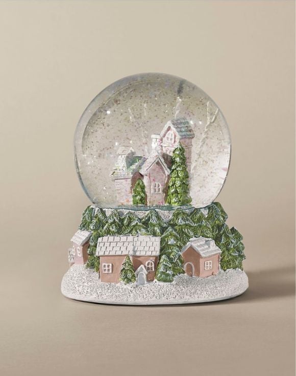 It’s a winter wonderland! Shimmery snow falls on a peaceful blush pink village with pastel evergreens. 5" diam. x 5 3/8" H. Imported.
