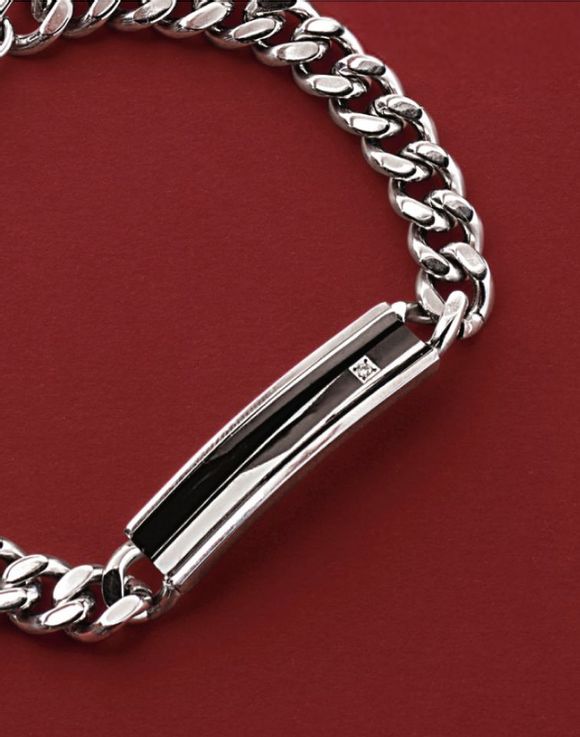 A streamlined bar bracelet finished in rich black-ion plating and a CZ accent pairs with a stainless-steel curb chain to create a strong, contemporary look offering clean lines and an understated edge.