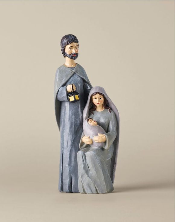 Holy Family presented in a simple, modest figurine, perfect to complete a serene Nativity scene. 4 3/8" W x 4" D x 7 7/8" H. Imported.