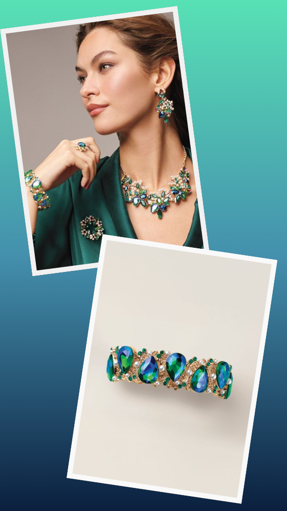 • Faceted glass stones in emerald green and sapphire blue with iridescent and pearly accents
