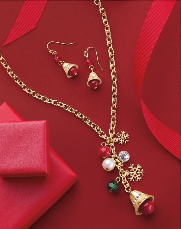 Let the season sing! Get festive with this necklace and earring set that delights with every step. Featuring dangling goldtone charms, shimmering pavé stones, pearlesque and colorful beads, each piece is designed with holiday cheer.