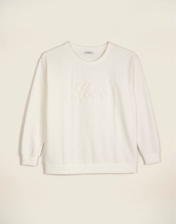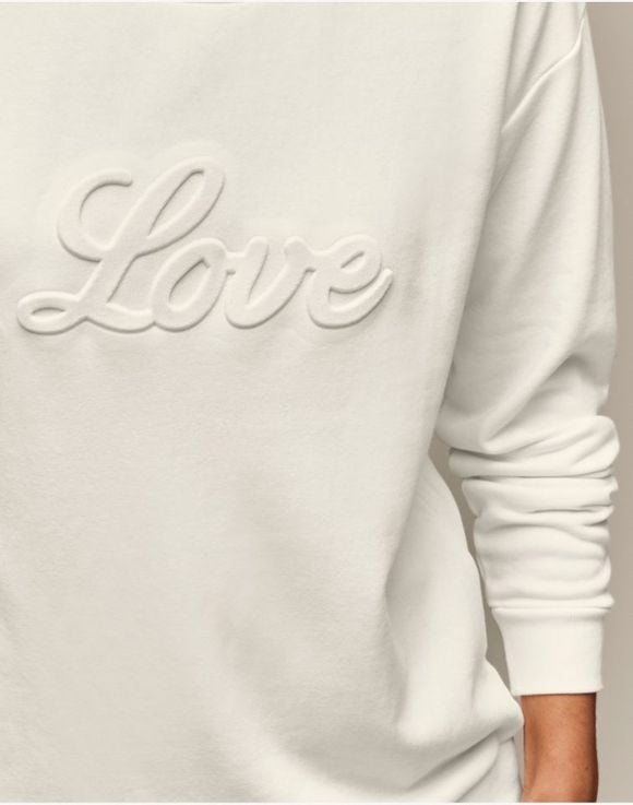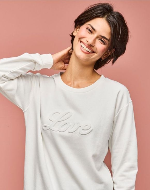 Make a statement in effortless style. A white sweatshirt embossed with the word “Love” features ribbed trim detailing on collar, cuff and hem. It is the perfect mix of cozy comfort and contemporary flair. Center back length: 25" on M; 27" on 1X. Imported.