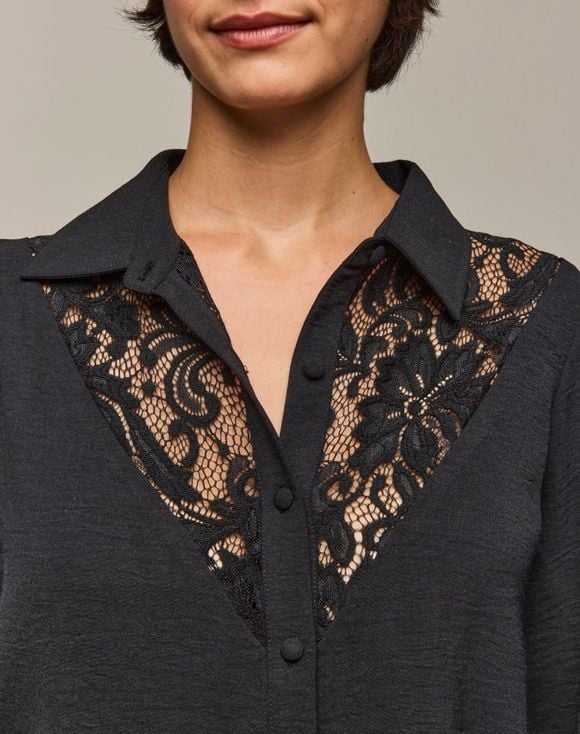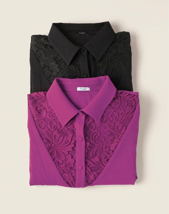 Bring elegance to your everyday wardrobe with this charming button-front blouse. Featuring delicate lace trim, it blends classic style with feminine detail. Available in Black or Violet. Center back length: 24½" on M; 26" on 1X. Imported.