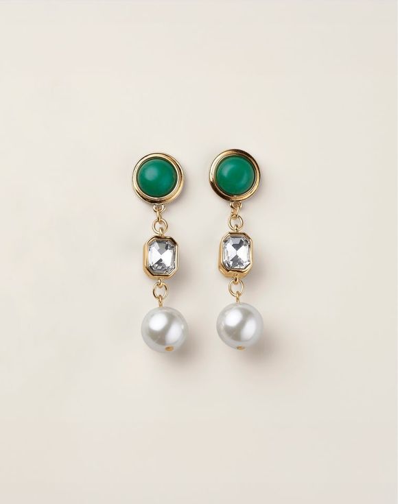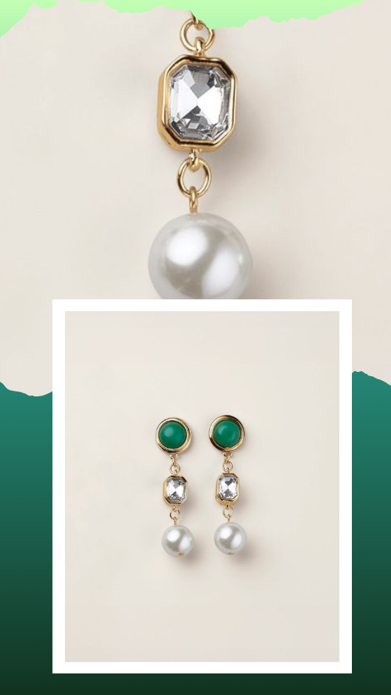 A graceful hint of sparkle. Shimmering pearl-like beads mingle with deep green accents and sparkling crystal glass, all set in warm goldtone, creating a look that’s both elegant and enchanting.