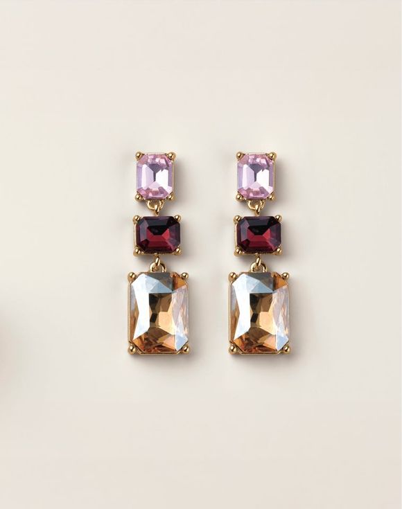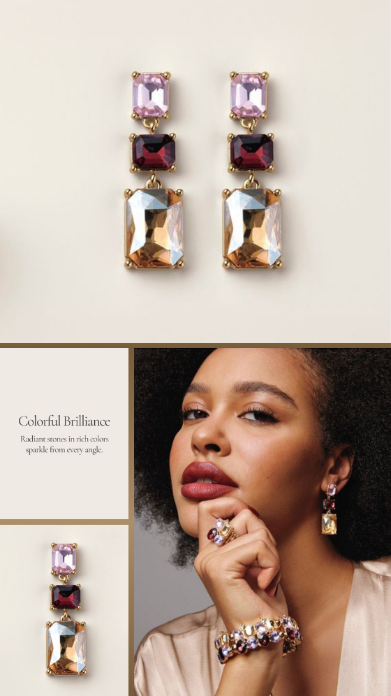 Bring the glow of golden hour to your look. A dramatic silhouette paired with radiant amethyst-, rose quartz- and topaz-like stones, creating a moment of instant glamour.