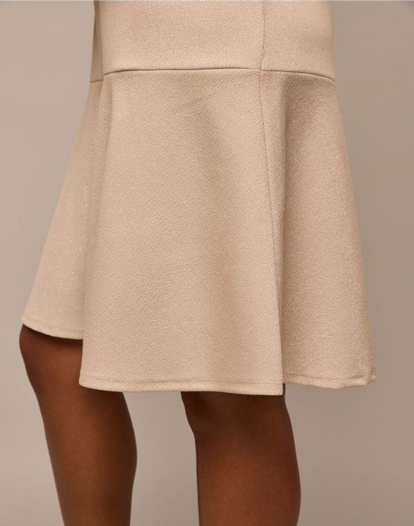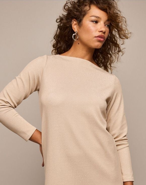 A champagne-colored boatneck dress with a flattering dropped waist silhouette is a graceful nod to simple femininity. The soft ribbed fabric is updated with metallic detailing for a modern touch. Center back length: 37" on M; 38" on 1X. Imported.