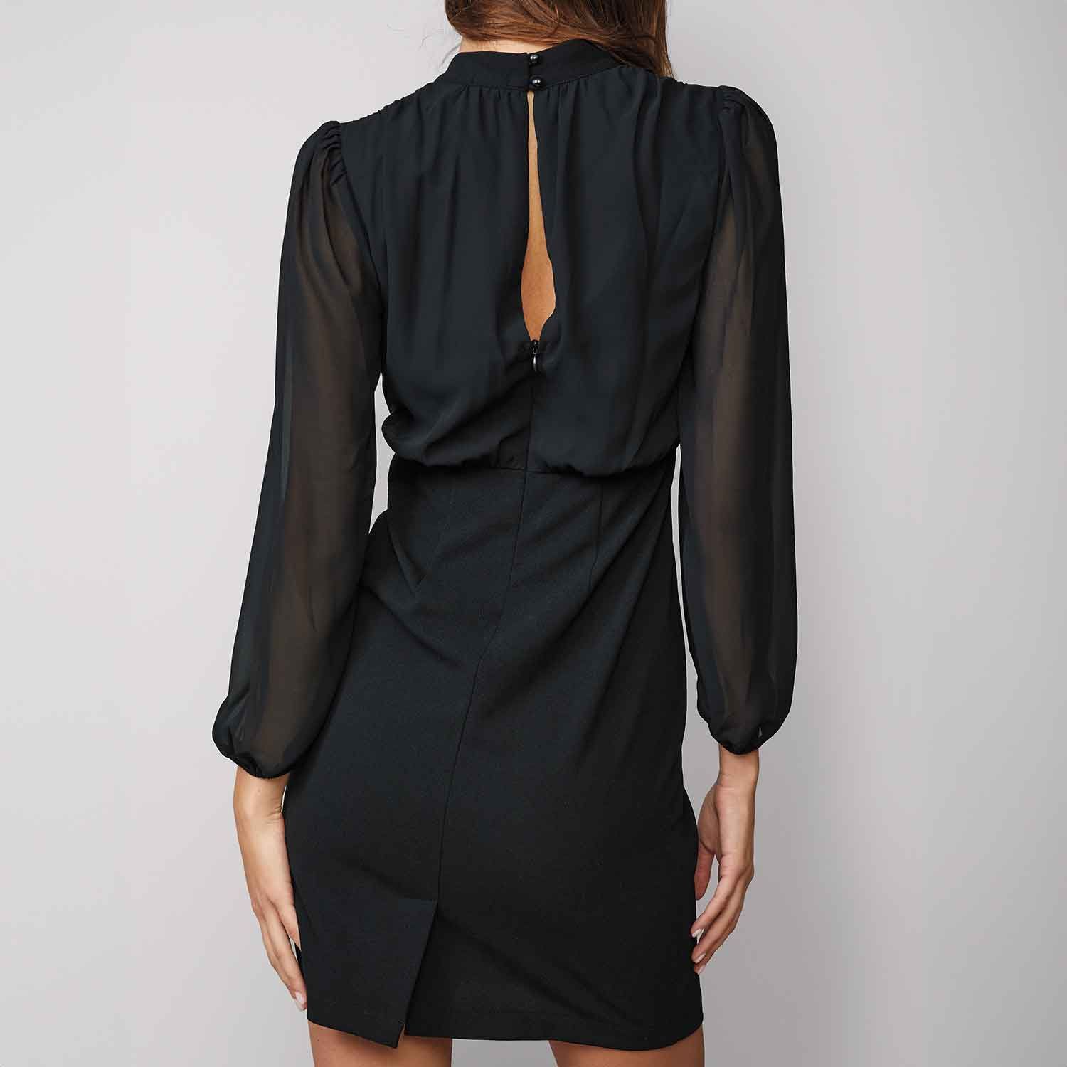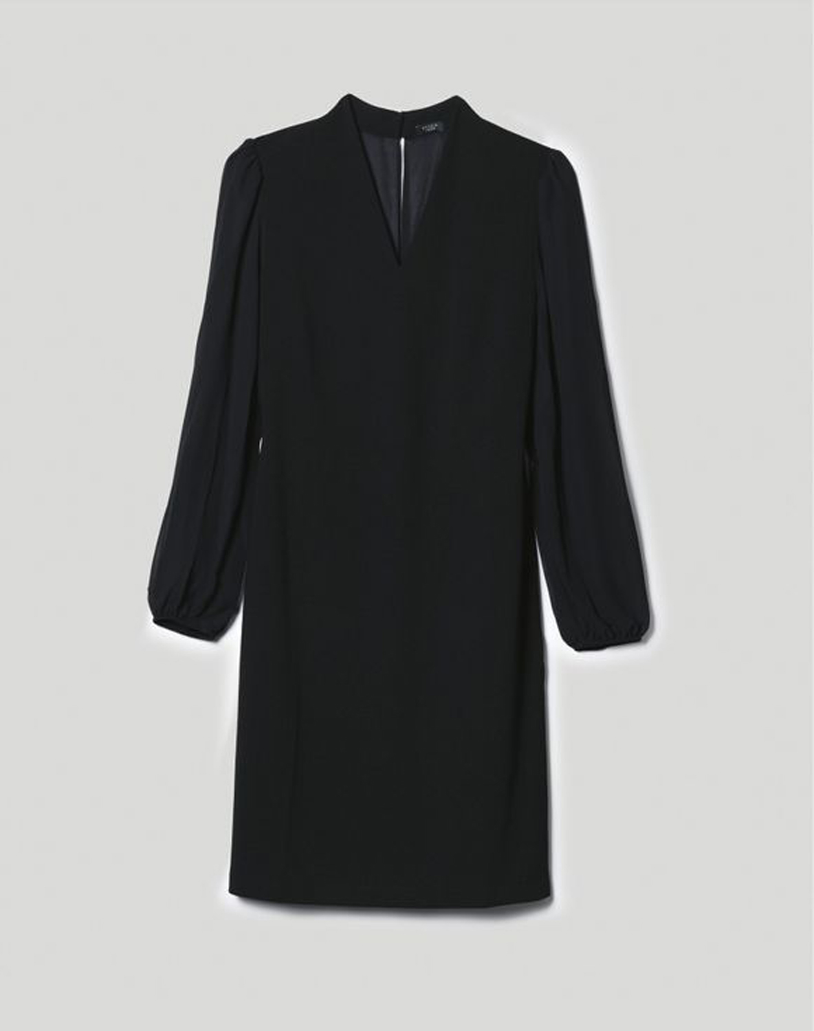 A timeless addition to your evening-out wardrobe. Billowy, sheer long sleeves and sheer back add an intriguing element to this demure black V-neck dress. The open-slit detail with double-button closure at the neck and zipper closure at the bottom of the slit elevate this understated design. Center back length: 36 1⁄2" on M; 38" on 1X. Imported.