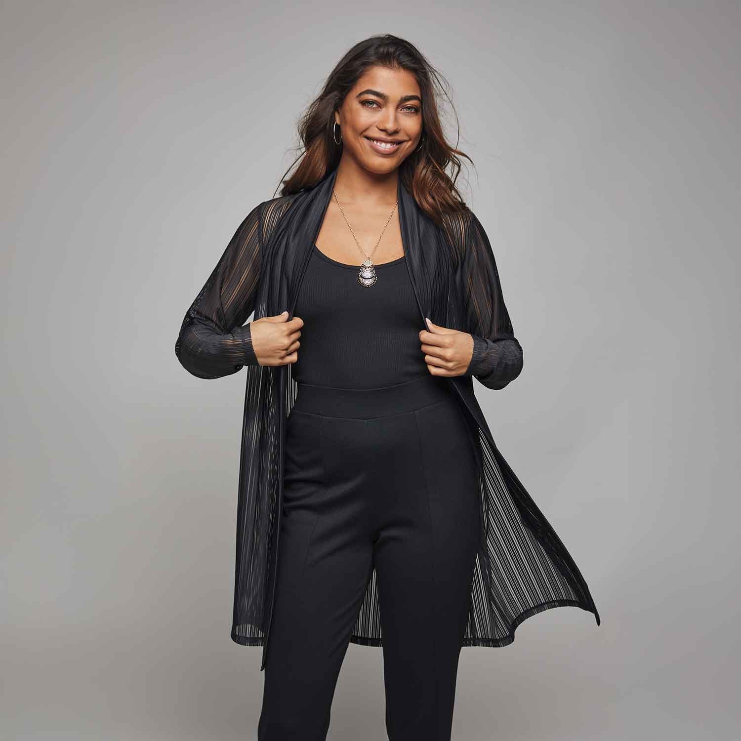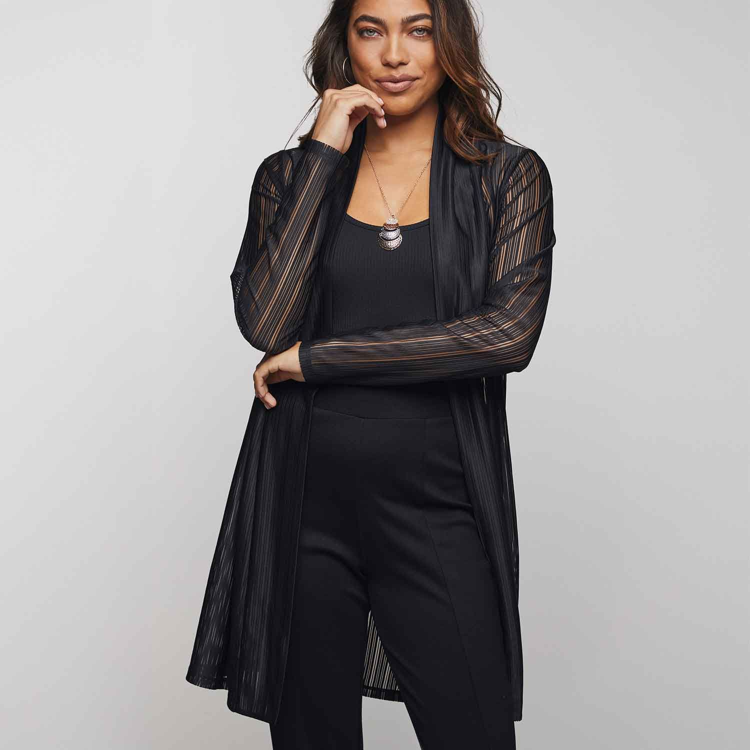 A chic cardigan that radiates confidence thanks to its black sheer burnout-stripe design. Detailed with an open front for an airy feel, this dressy layer has beautifully draped long sleeves. Center back length: 35" on M; 37" on 1X. Imported.