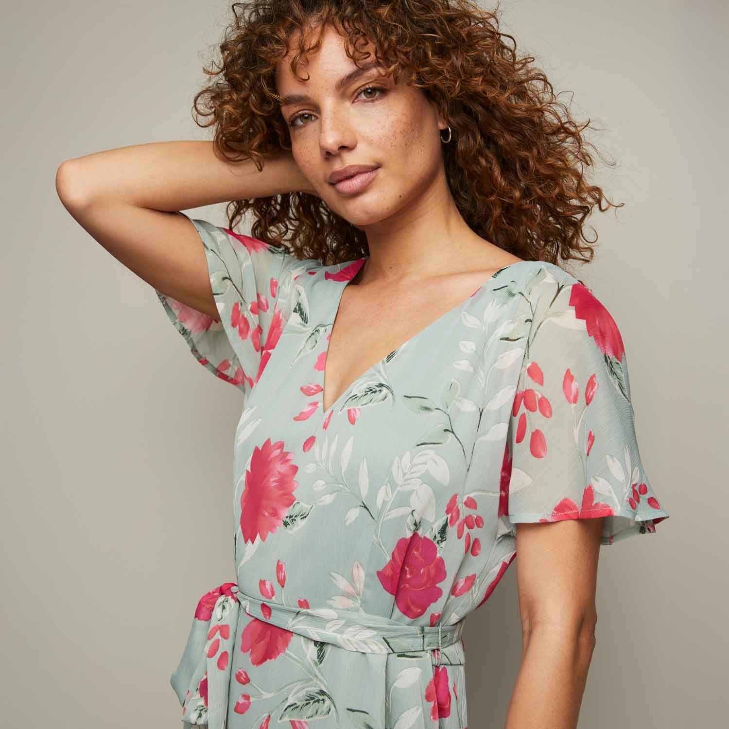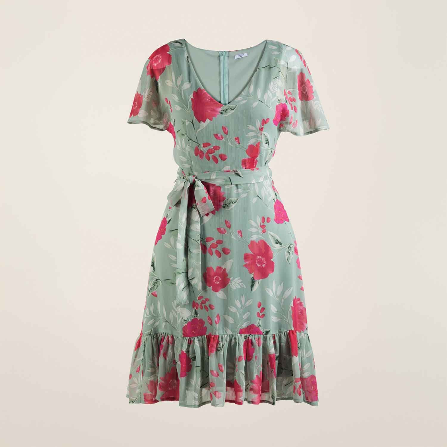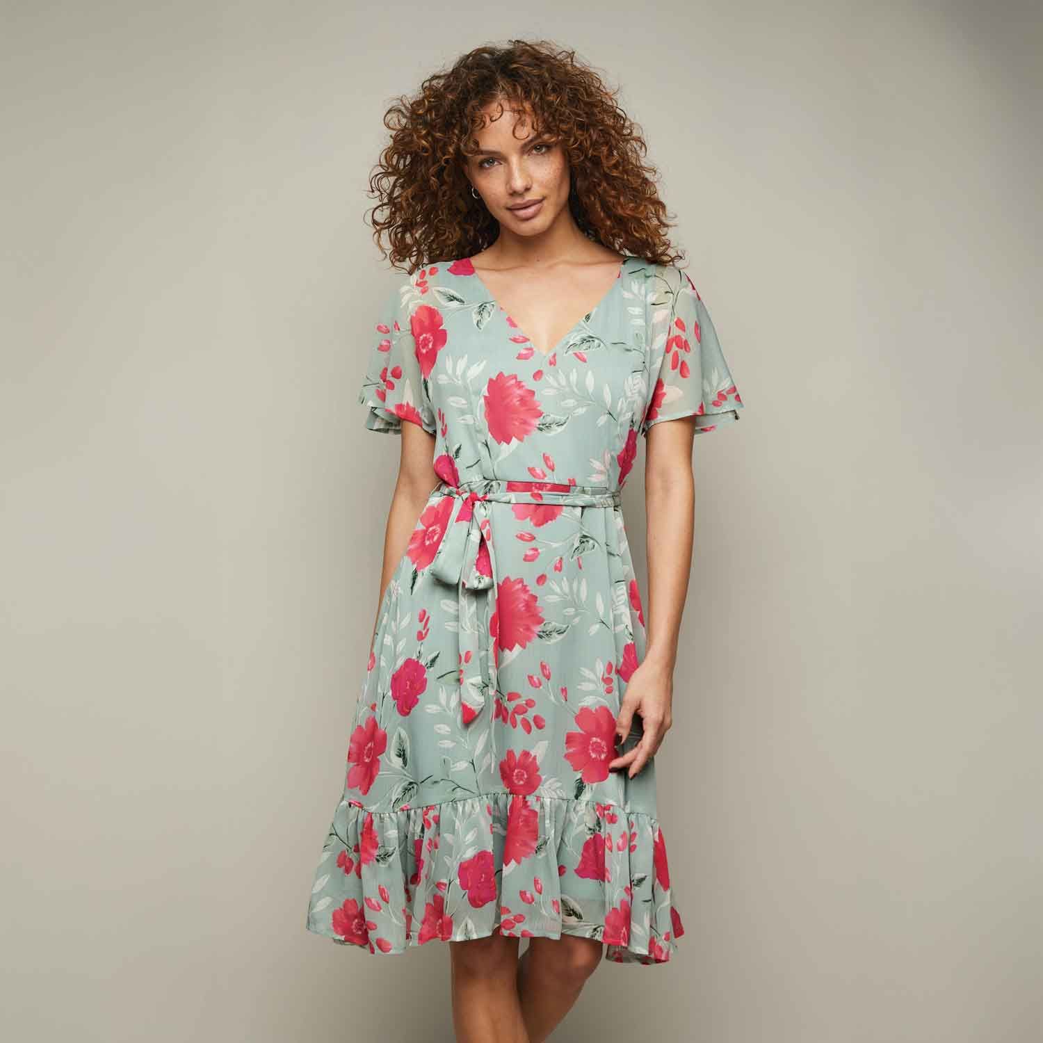 Say hello to your new spring favorite! This light green chiffon dress, adorned with a vibrant fuchsia floral print, is the perfect mix of playful and feminine. Featuring a flattering V-neckline, flutter sleeves, and a ruffle hem, it’s got all the right details for effortless charm plus a self-tie fabric belt for a figure-flattering finish. Center back length 40 ¾" on M; 42" on 1X. Imported.