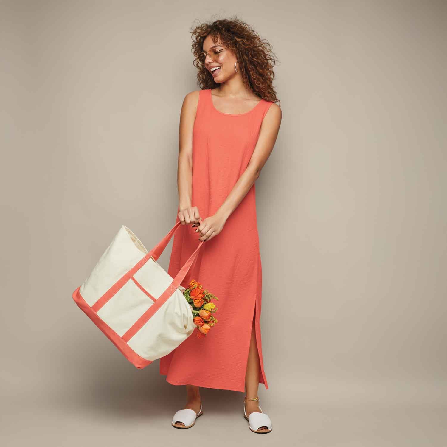 Look as sweet as a peach in this sunny staple! The vibrant peach hue adds a juicy twist to this maxi style while the light and breezy gauze fabric creates a relaxed fit. This sleeveless, laid-back look features a round neckline and stylish side slits. Center back length: 47" on M and 1X. Imported.