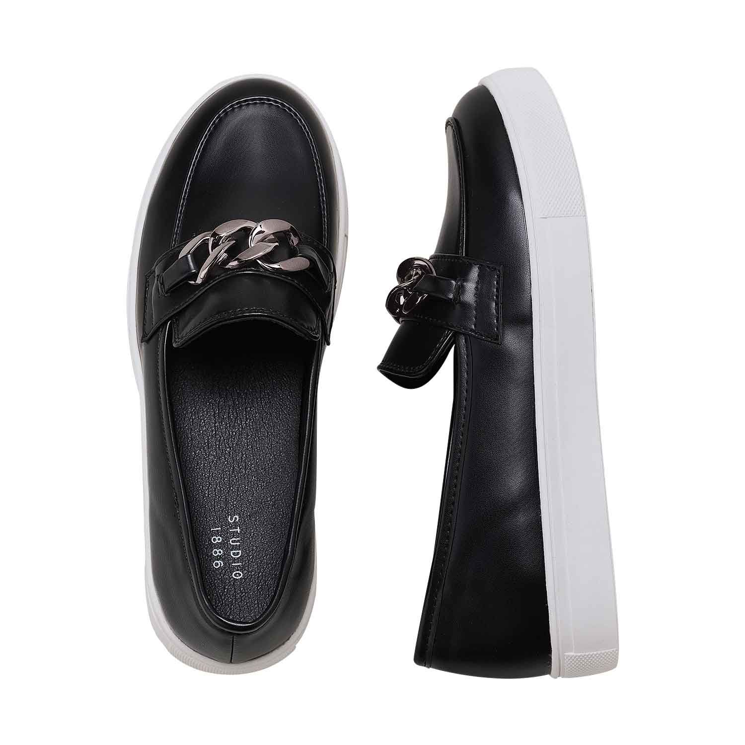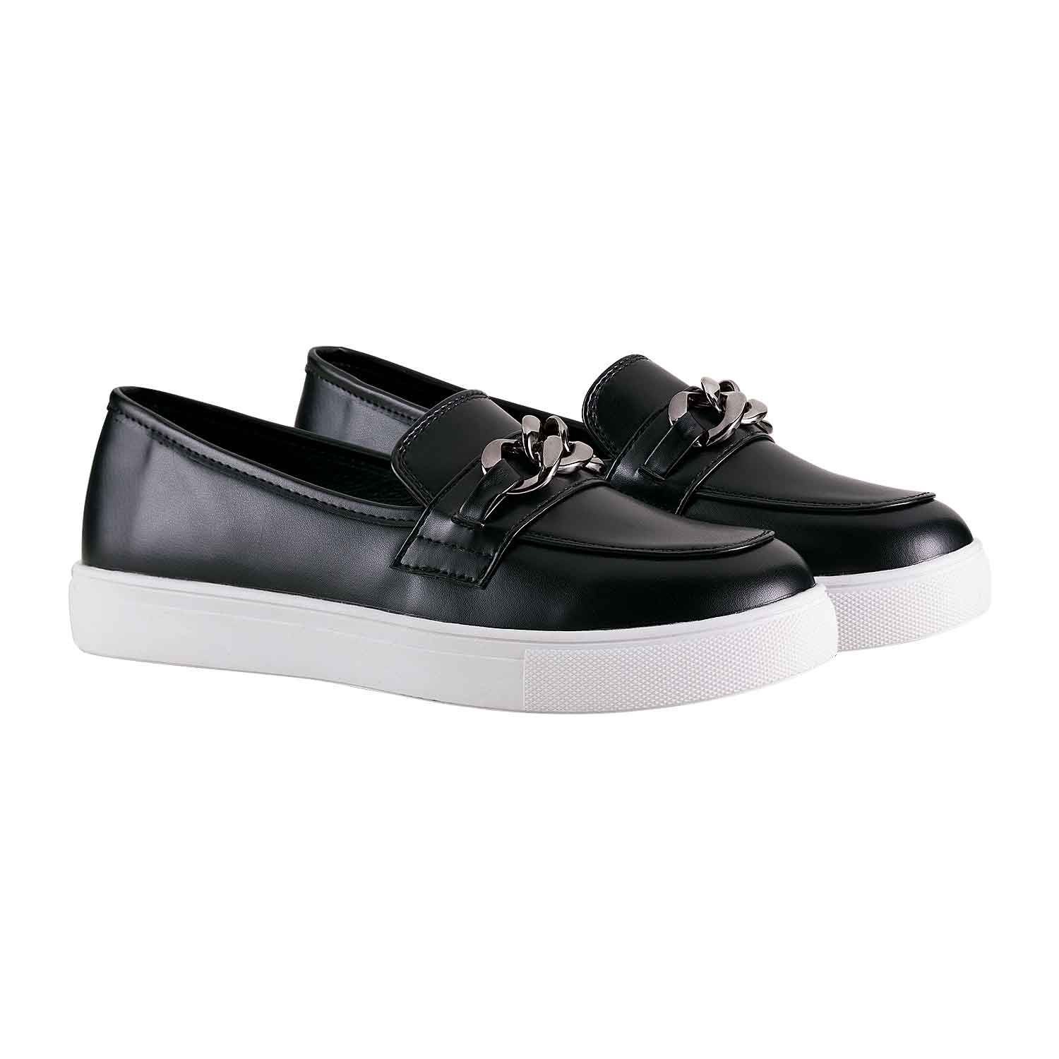 Form and function combine in this elevated slip-on adorned with a chain detail on the upper. With its hybrid loafer and sneaker design, this comfortable yet chic style comes in classic black with a white sole. Imported.