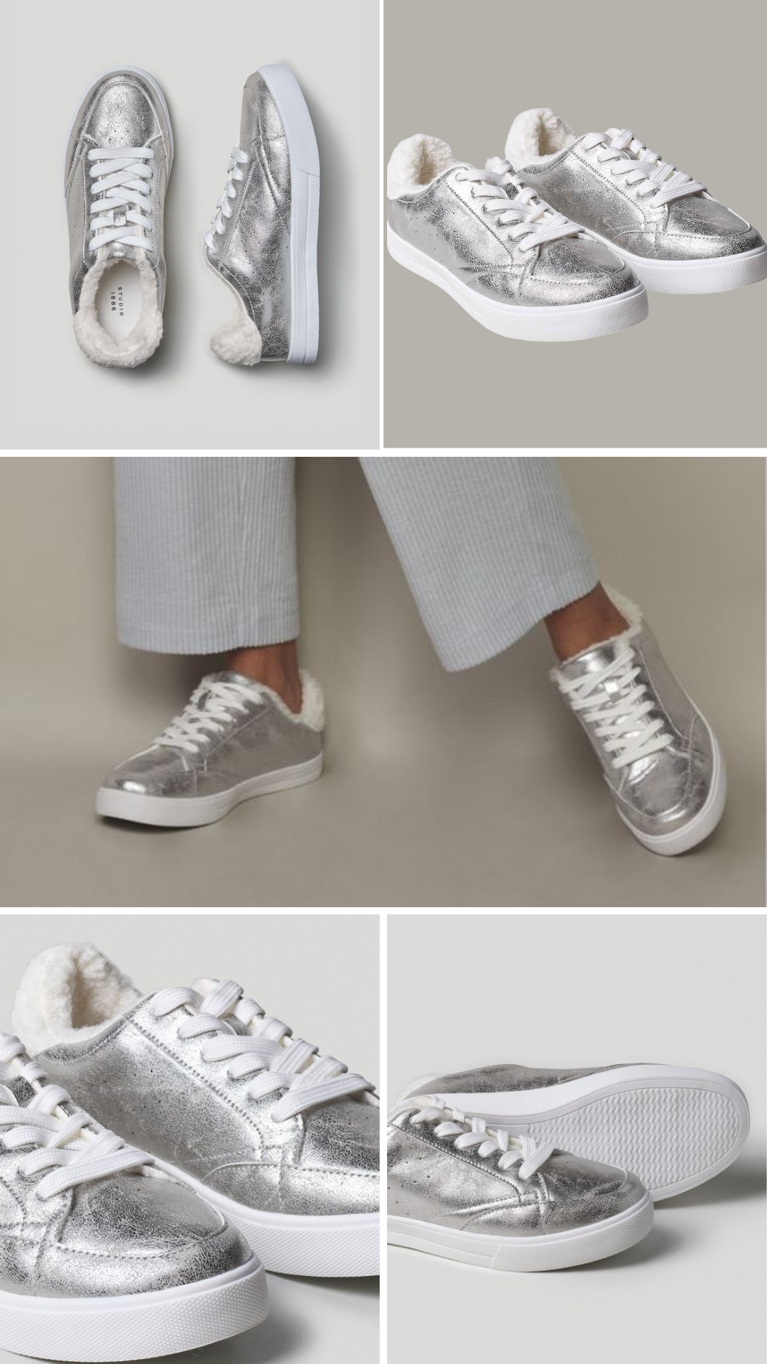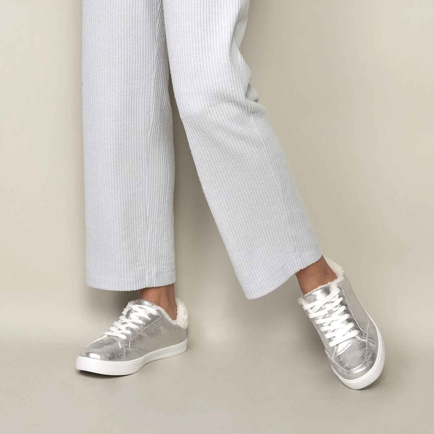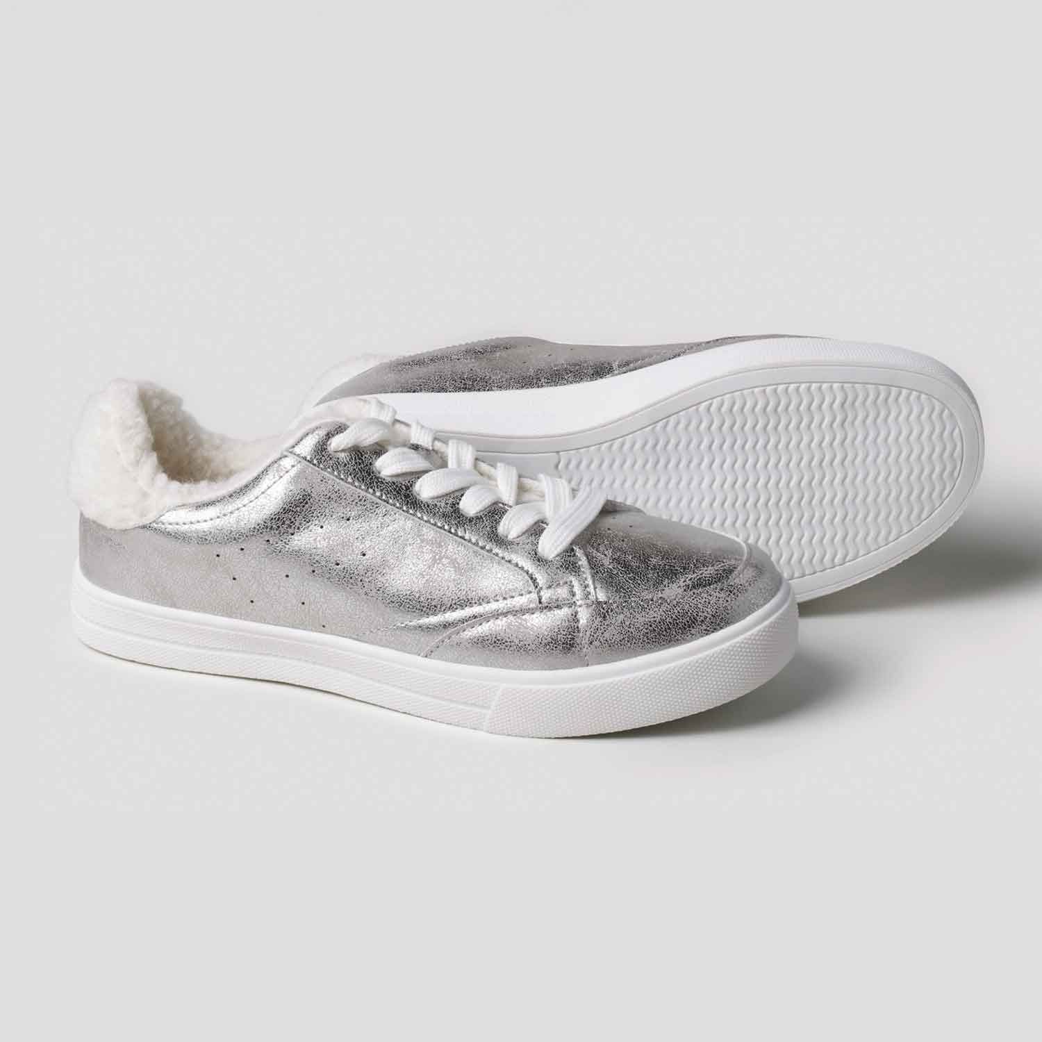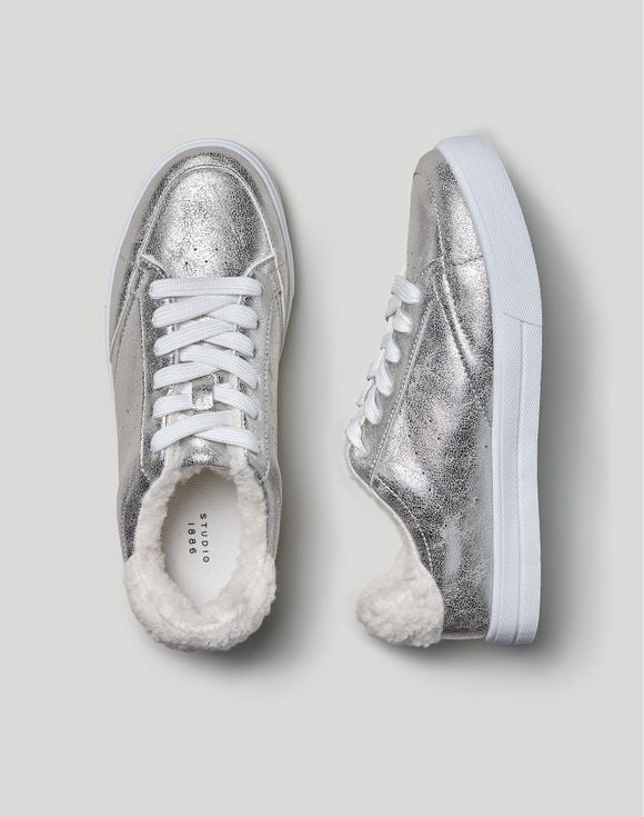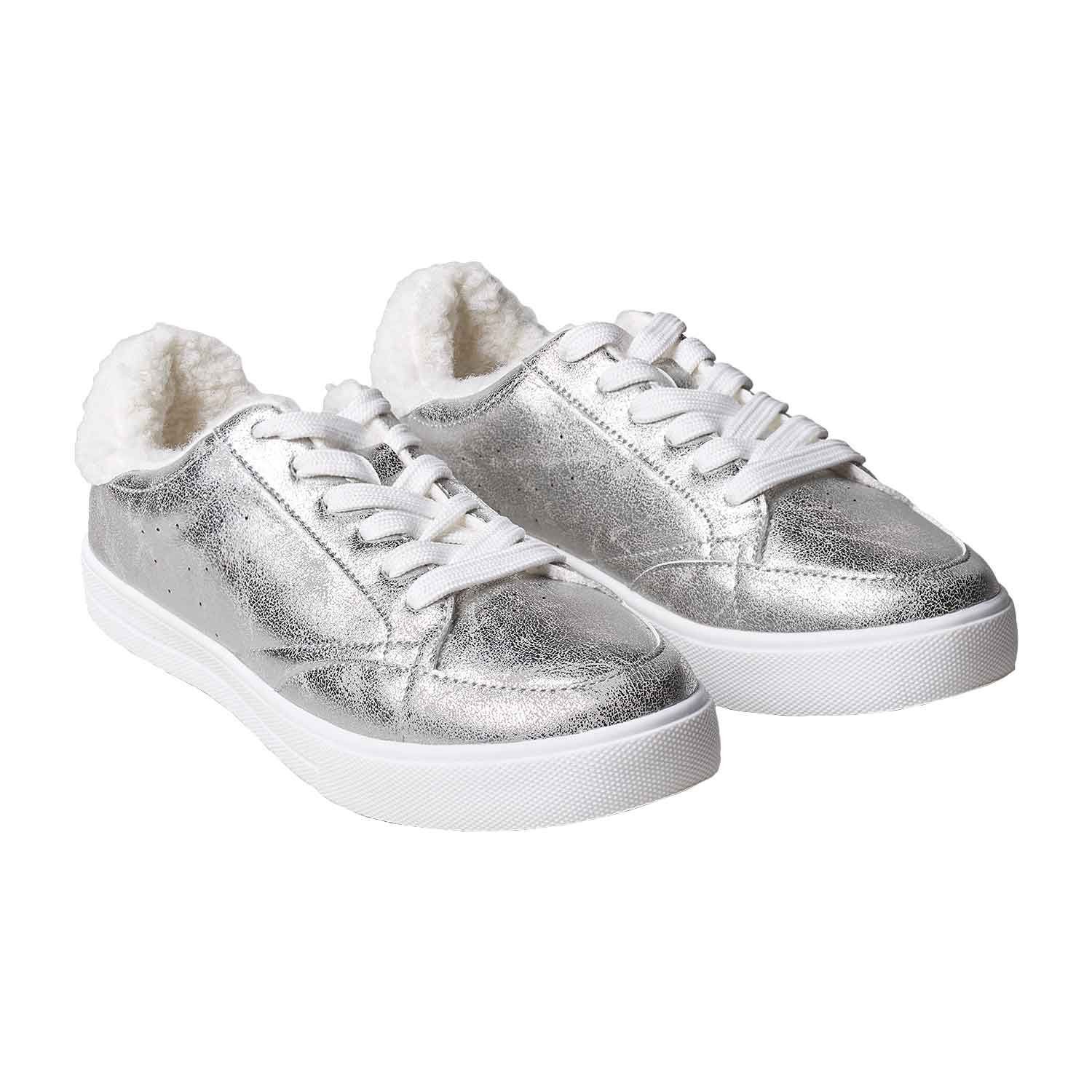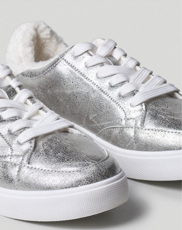 A gray metallic faux-leather lace-up sneaker Completes your ensemble with cool confidence. Punctuated by an ivory faux-shearling trim on back, tongue and lining, this comfortable pair is packed with wear-with-everything appeal. Imported.