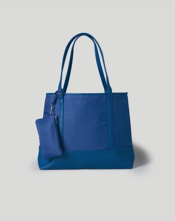 Style meets function in this extra-roomy, vibrant blue tote bag perfect for everyday wear. Detailed with leatherlike panels and magnetic closure. Includes detachable zipper pouch. Imported.