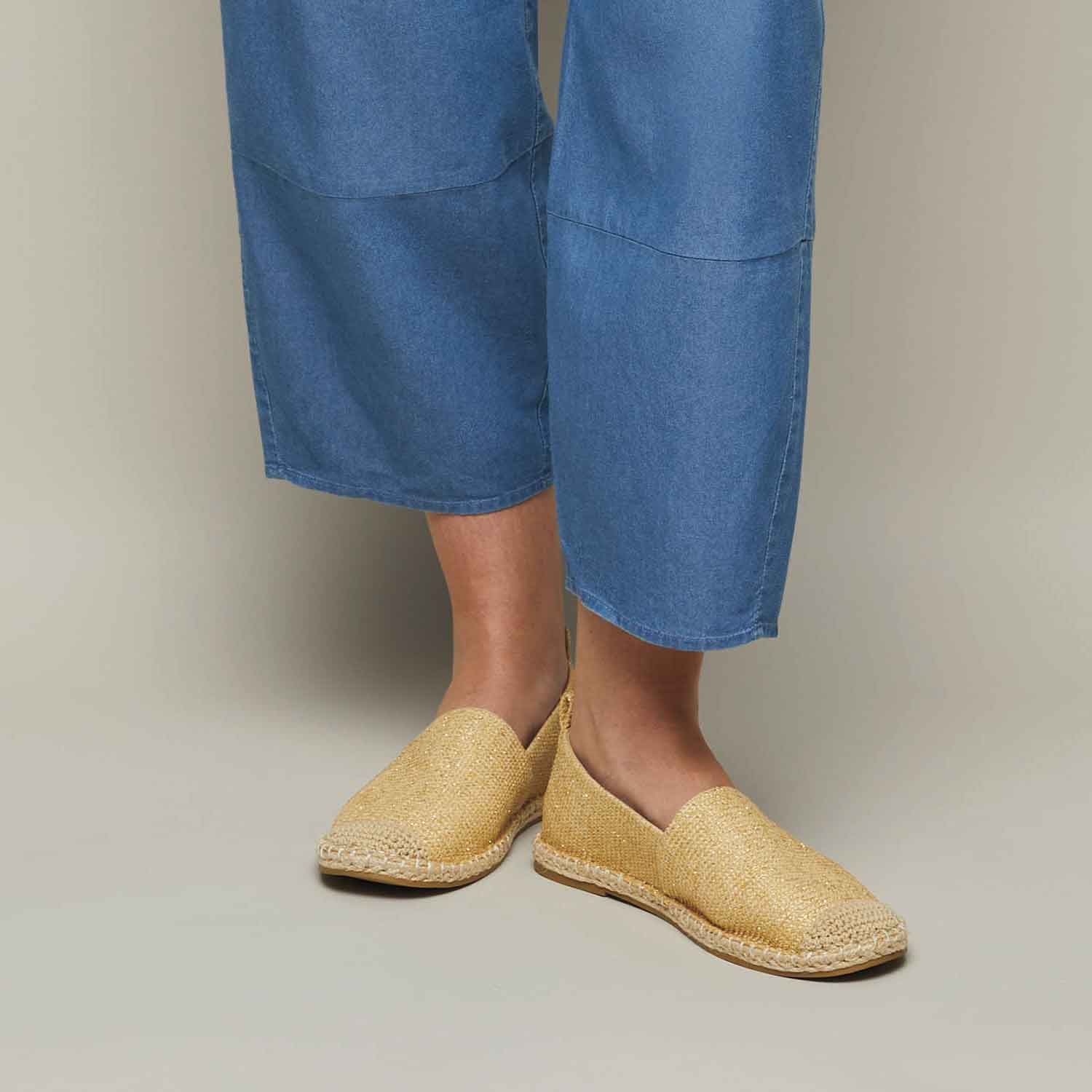 Crafted with a golden woven design, this metallic espadrille is made for sun-drenched strolls along the beach. Styled with a back pull-tab for easy on/off, this sophisticated yet laid-back pair features a jute rope midsole, knit fabric toe cap and rubber outsole. Half sizes, order one size up. Imported.