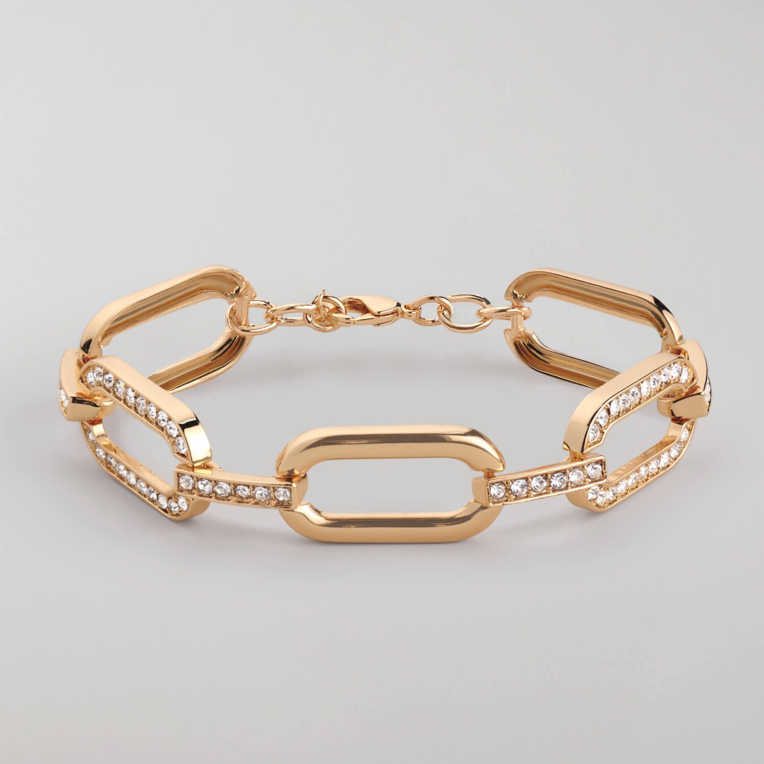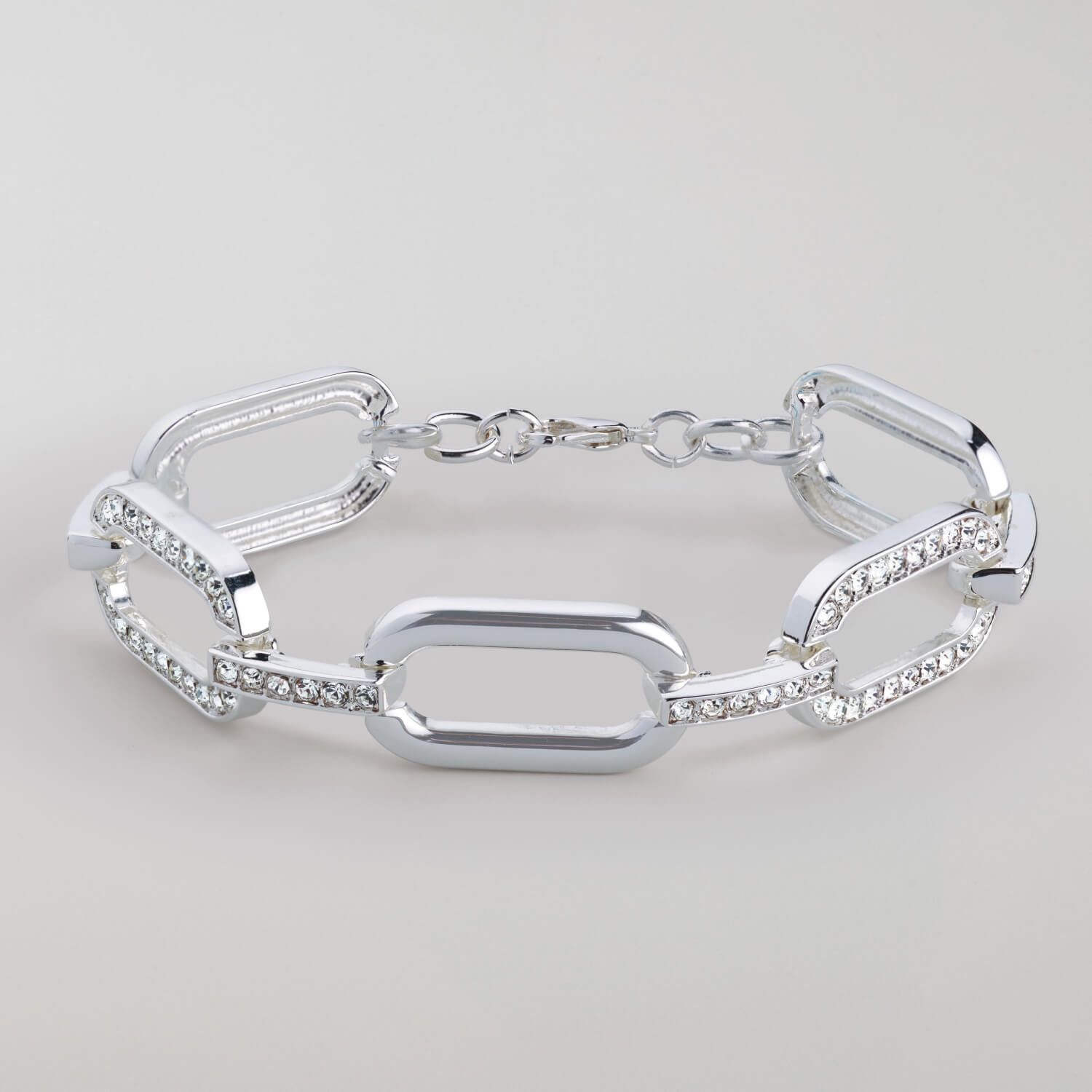 Modern open-link bracelet embellished with crystal pavé creates a sparkling statement. Choose from goldtone or silvertone. Matching necklace and earring set also available.