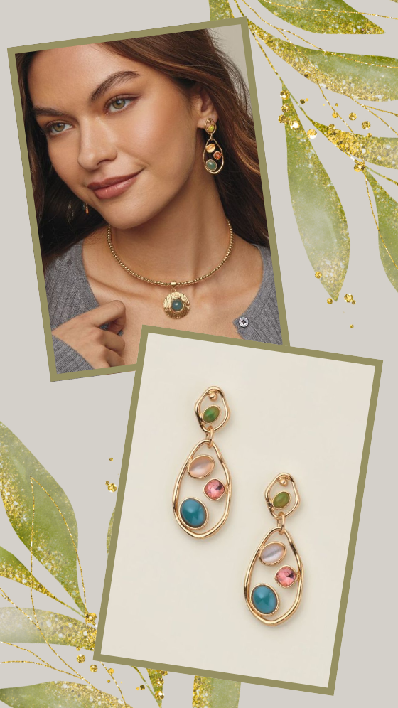 Softly radiant with a touch of nature’s charm, these drop earrings add a hint of serenity to any look. A colorful arrangement of earthy gem-like stones are set within an organically shaped goldtone frame