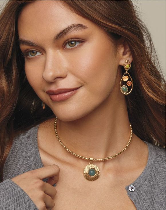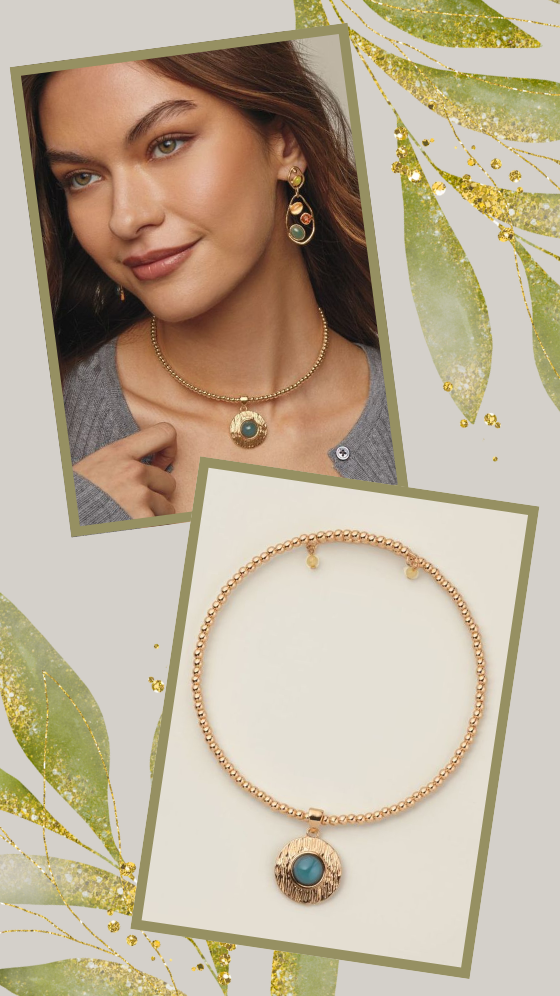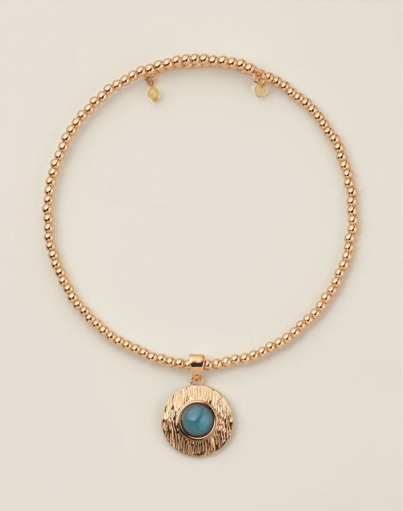 Delicate and grounded in natural elegance, this choker adds effortless charm to any neckline. Designed with a coiled beaded wire chain that hugs gracefully, it features a goldtone pendant centered with a soft-tone blue-green stone — evoking the calm beauty of a quiet meadow sky.