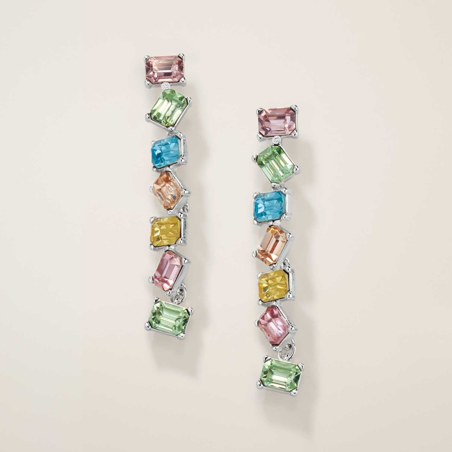 Dazzling drops of rainbow-colored rectangular stones lend a playful elegance to your jewelry collection. Set in silvertone, this light-catching pair are true conversation piece. Matching necklace and bracelet are also available.