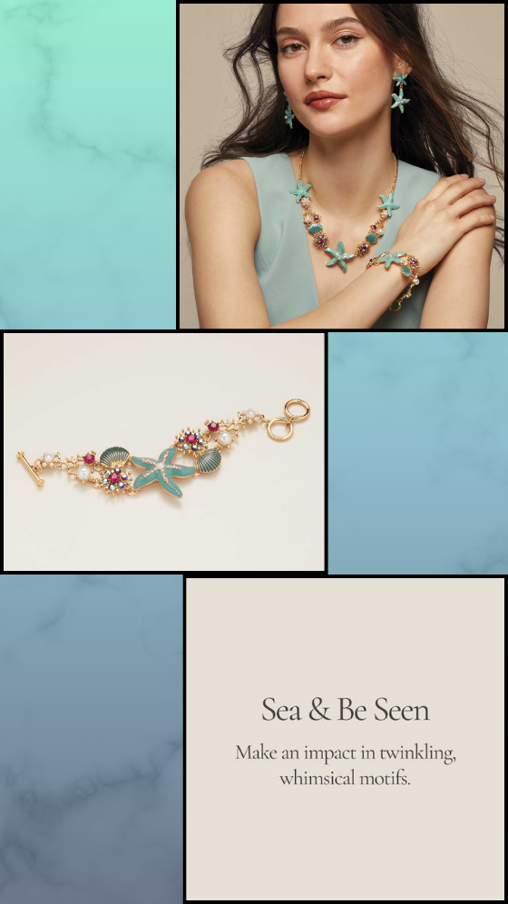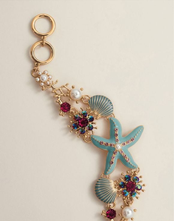 Make waves with an enchanting sea-themed bracelet. Vibrant turquoise starfish and seashell motifs are highlighted in a pearly-accented goldtone setting as a dazzling tribute to the beauty of the sea.