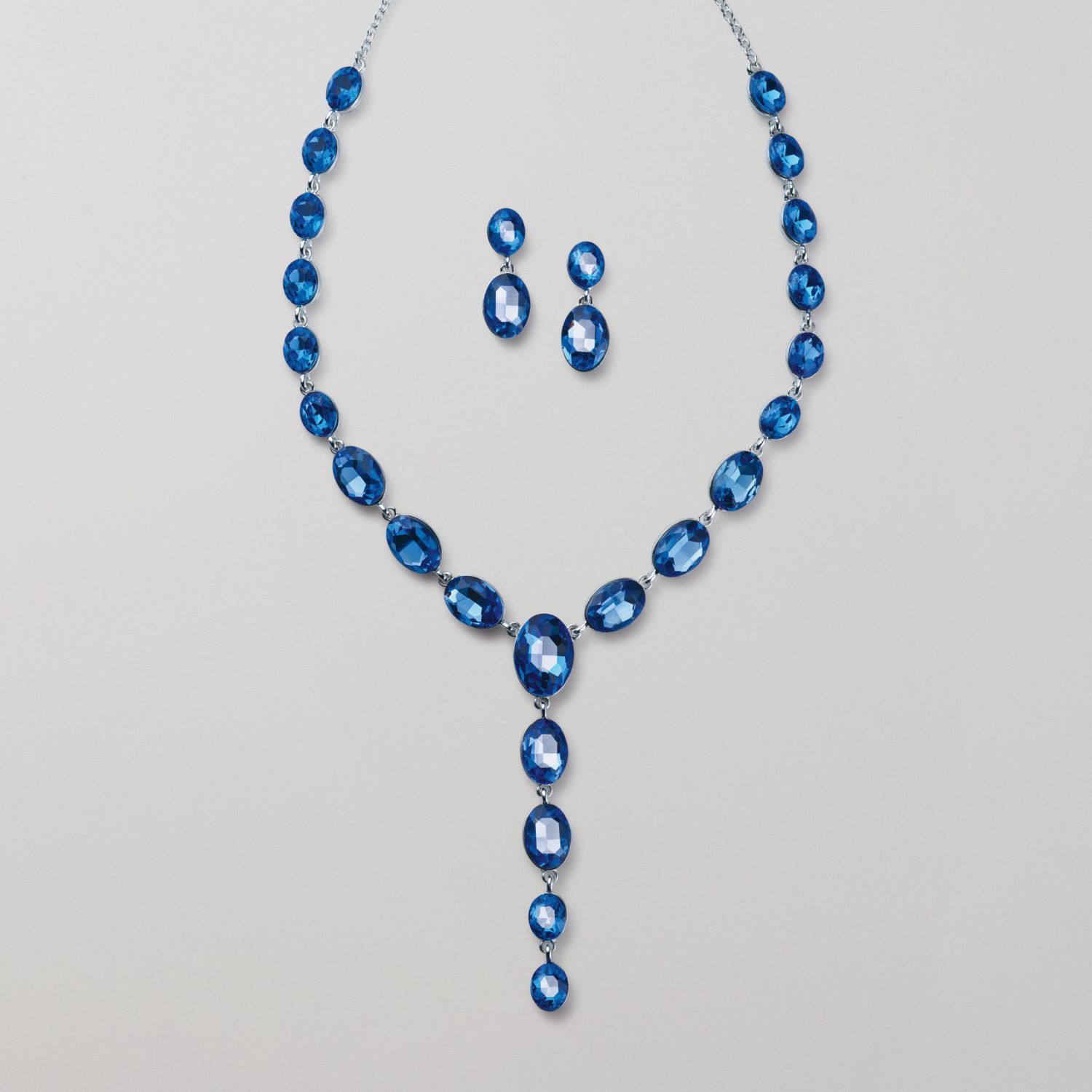 Marine-blue facet-cut stones shimmer like drops of the ocean in this Y-style necklace and earrings.
