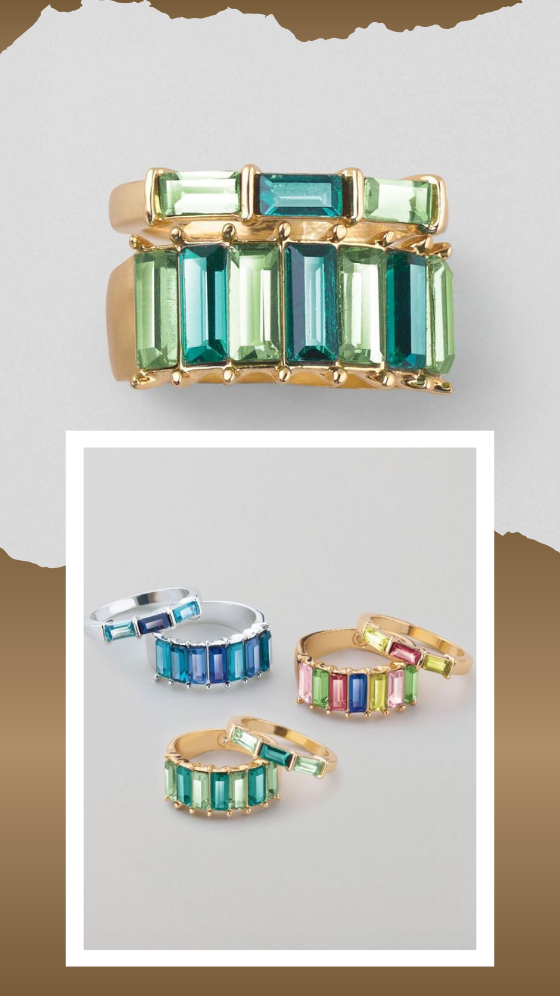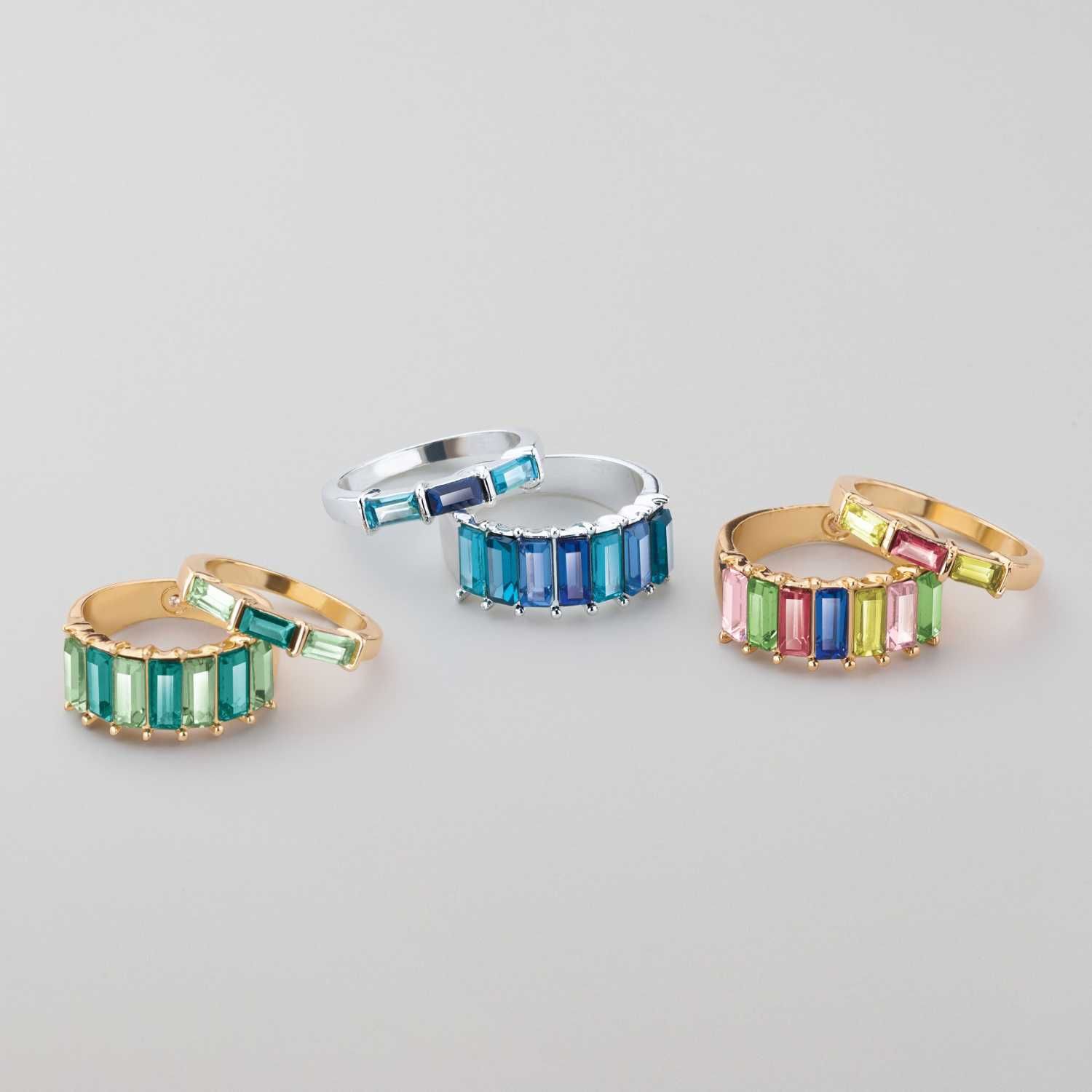 Looking for that special finishing touch? Go for extra sparkle with a bedazzled ring set. Available in three vibrant styles: green/goldtone, blue/silvertone and multicolor goldtone. Matching earrings also available.