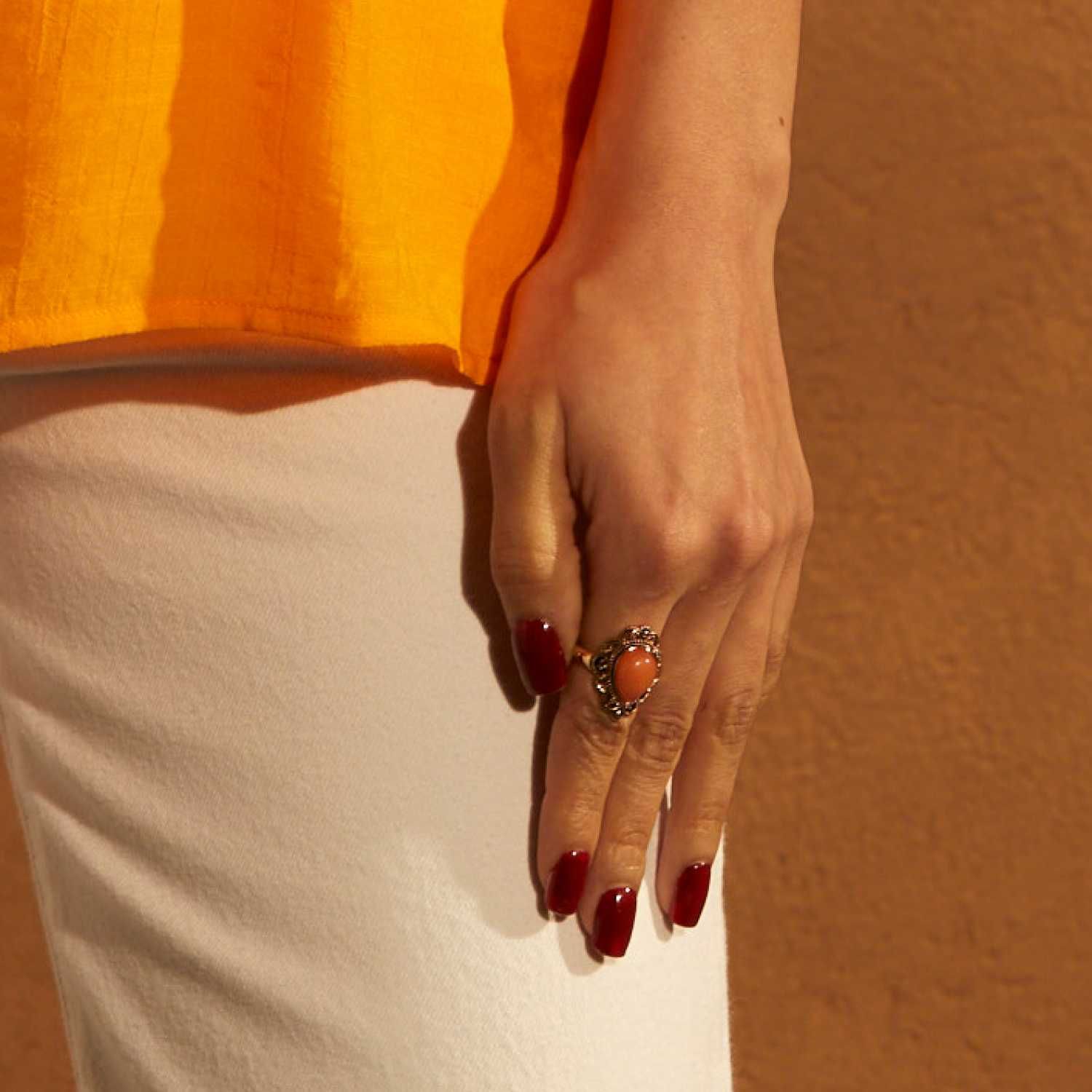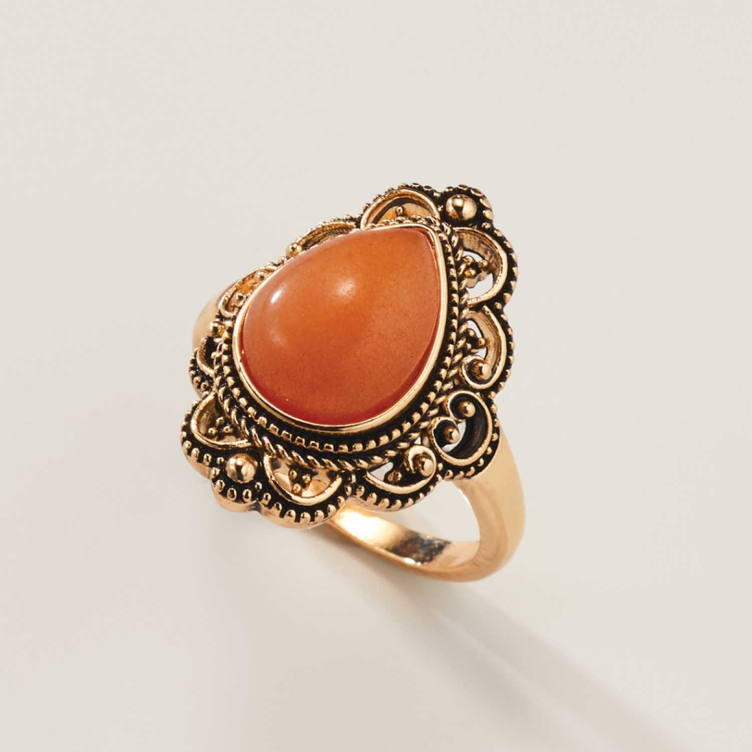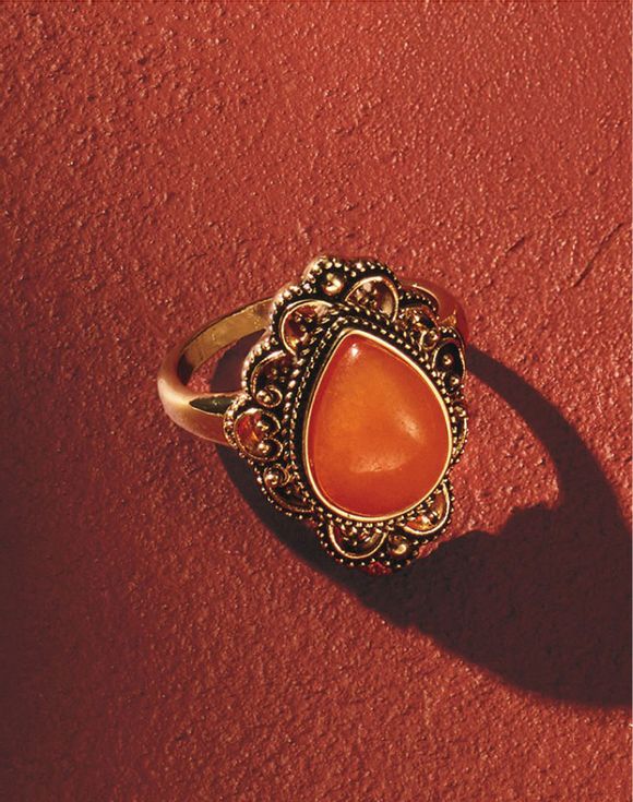 Emulating the vibrance of the Moroccan sunset, this striking teardrop-shaped ring highlighted by a semi-precious, amber-colored stone elicits feelings of warmth and positivity. The elegant curves of the goldtone setting are inspired by the ornate arches of Moorish architecture.