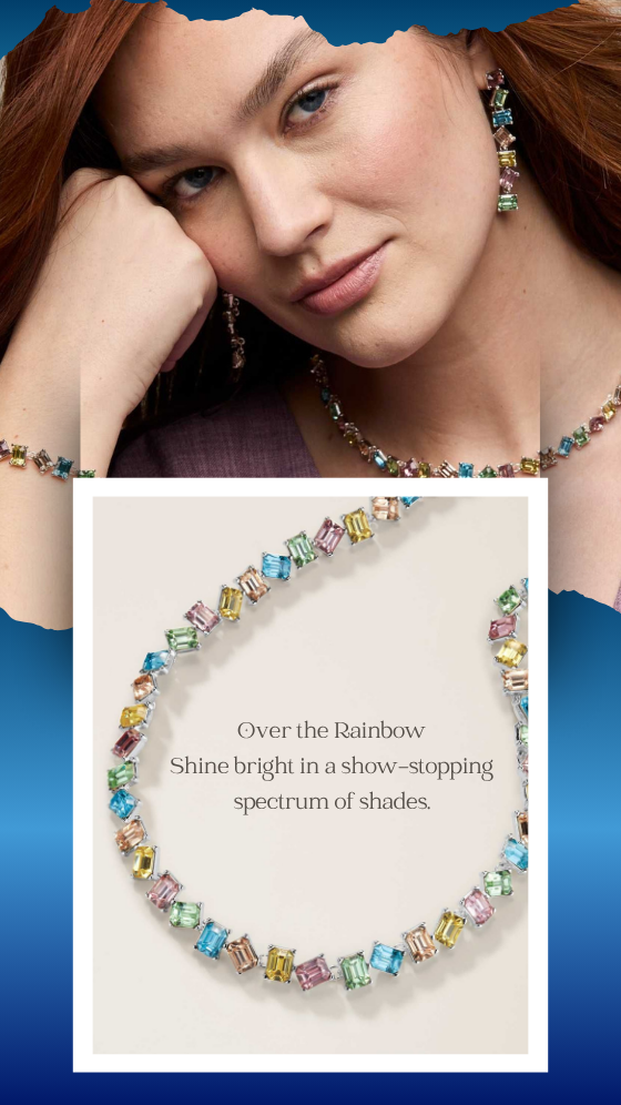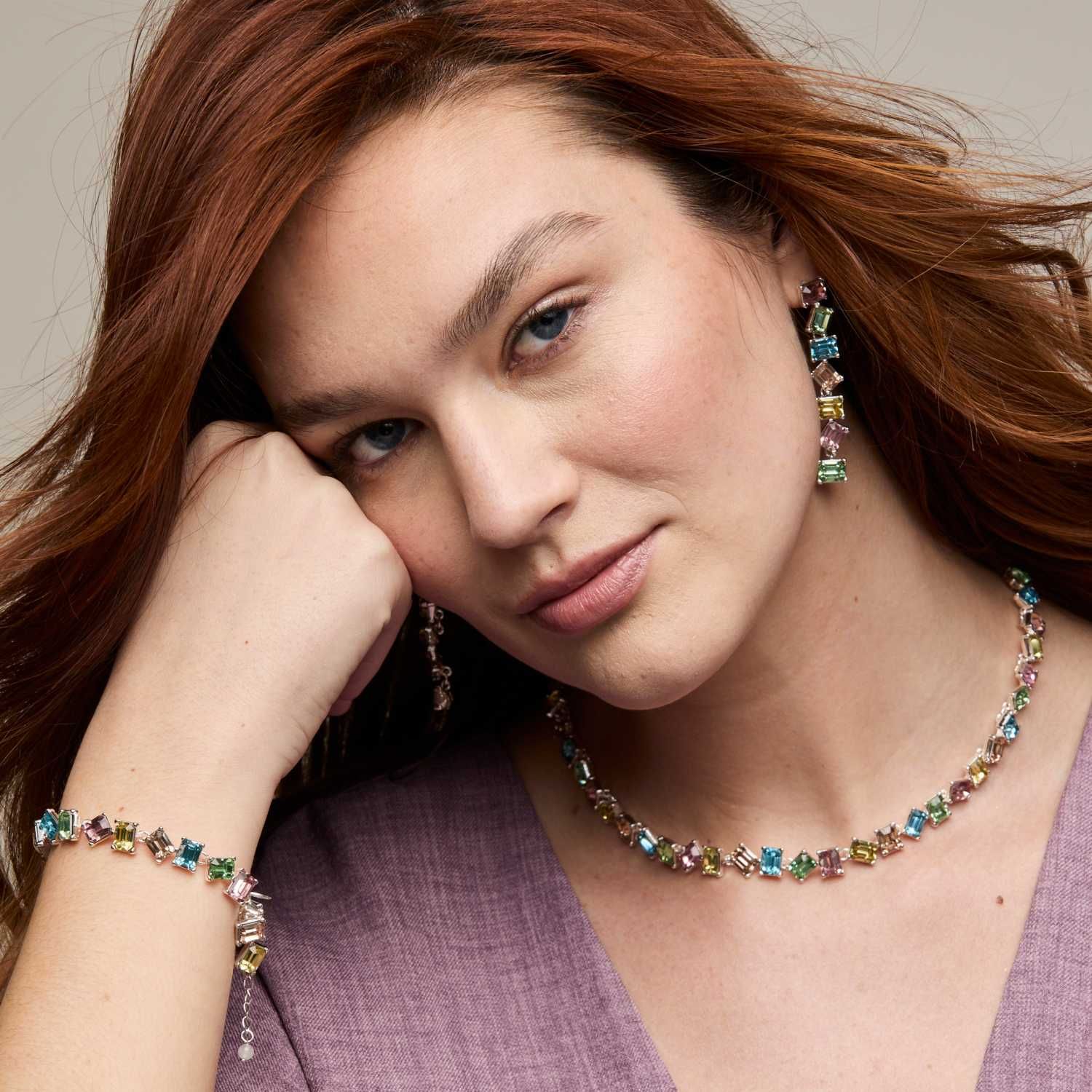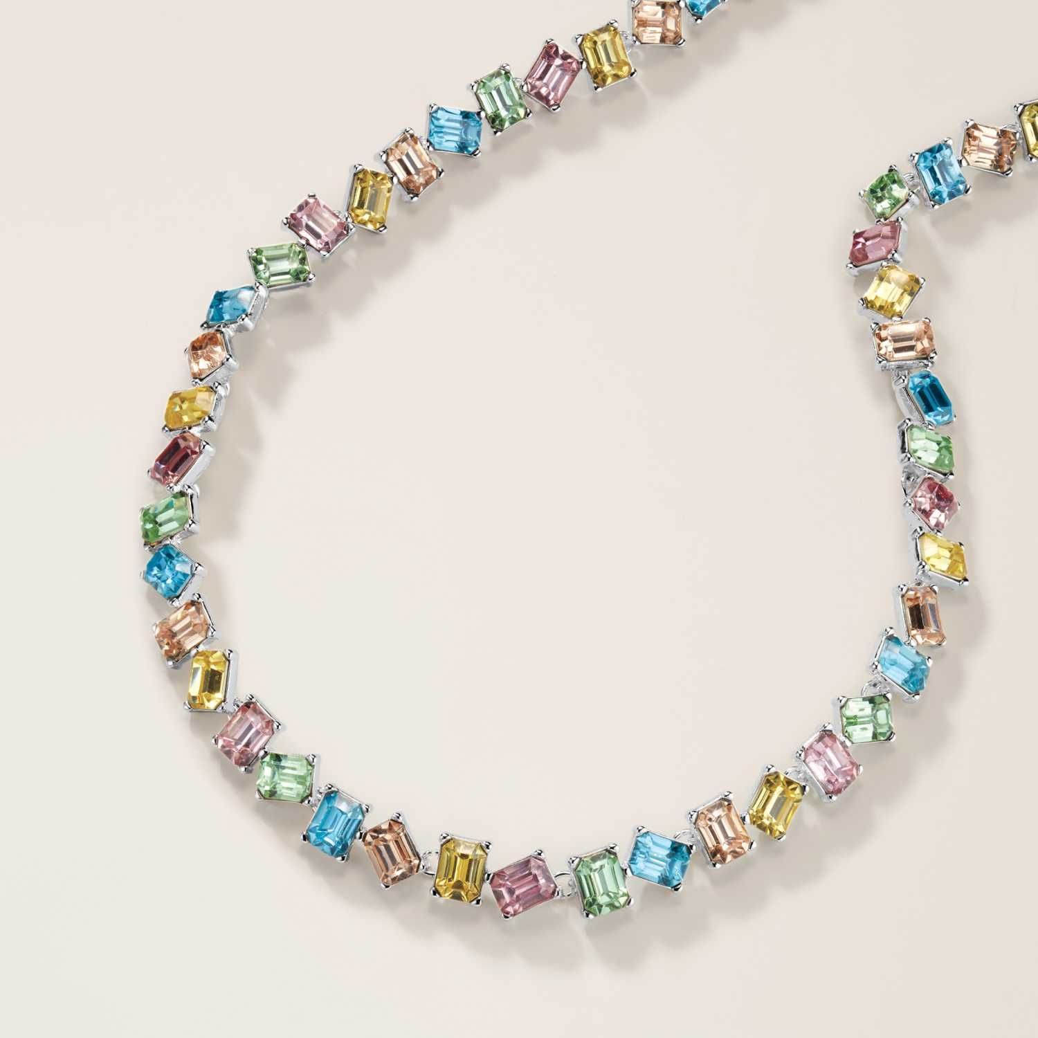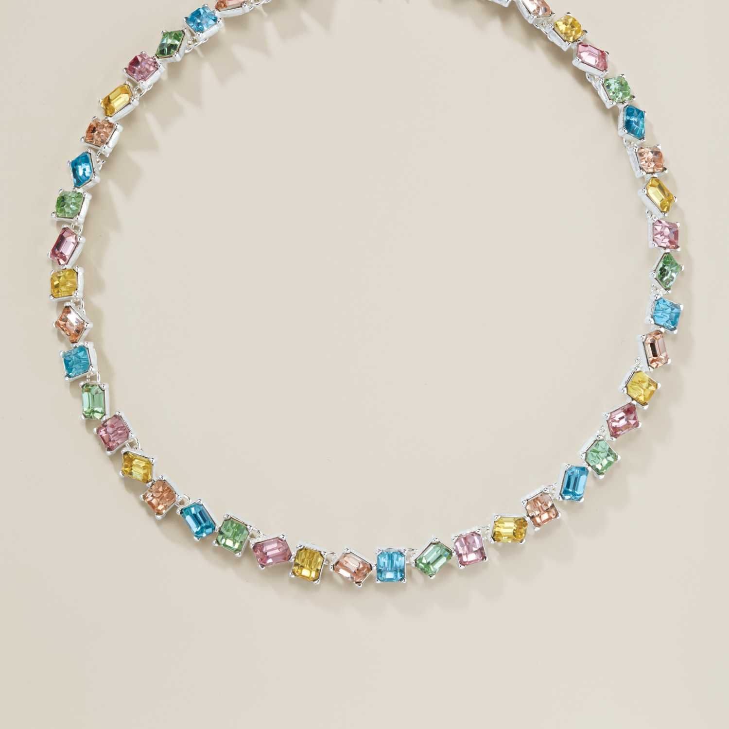 A sparkling array of pastel-colored rectangular stones brings modern refinement to this statement necklace. Set in silvertone, the playful arrangement of stones offers a fresh take on the classic eternity necklace. Matching earrings and bracelet also available.