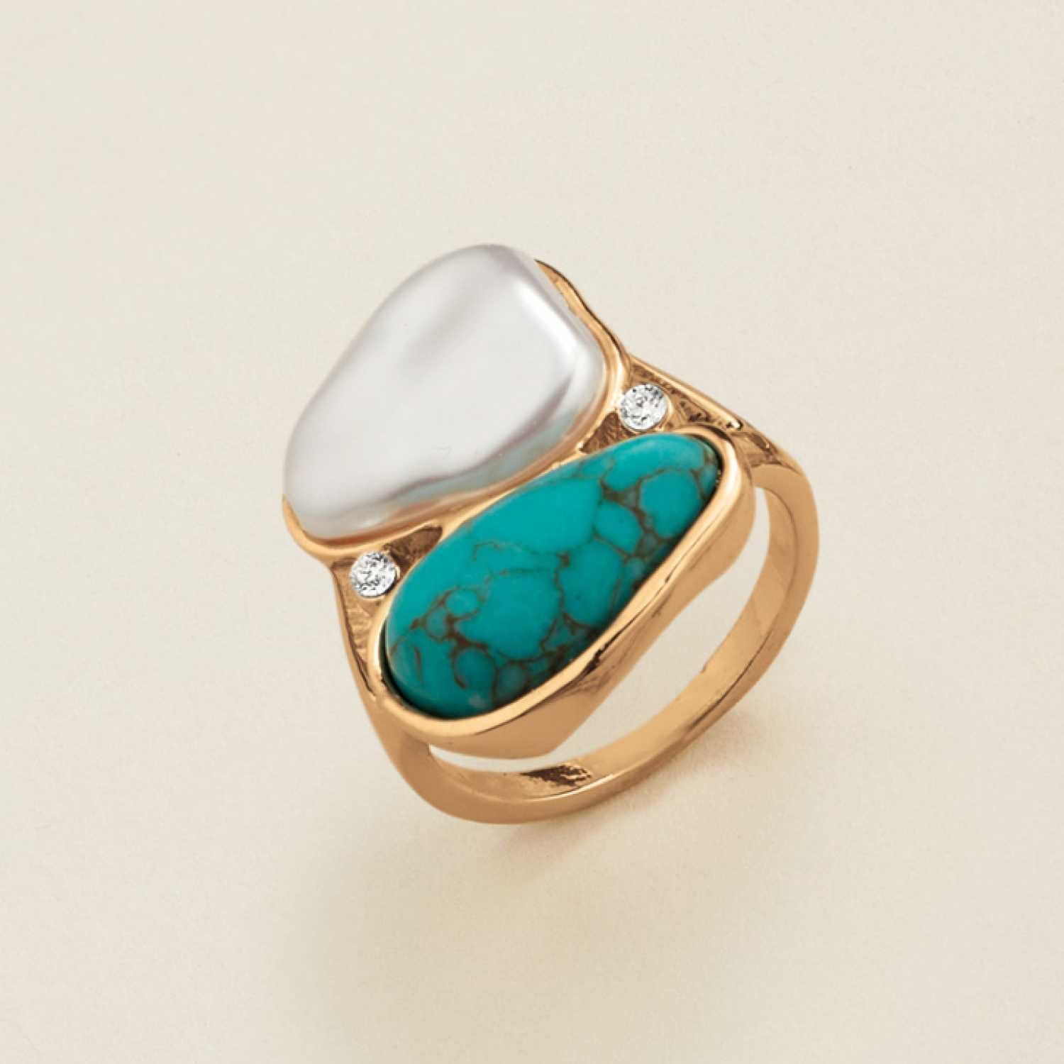 The perfect balance of classic and modern, this striking ring features a captivating combination of smooth turquoise and a lustrous pearly accent set in a radiant goldtone band.