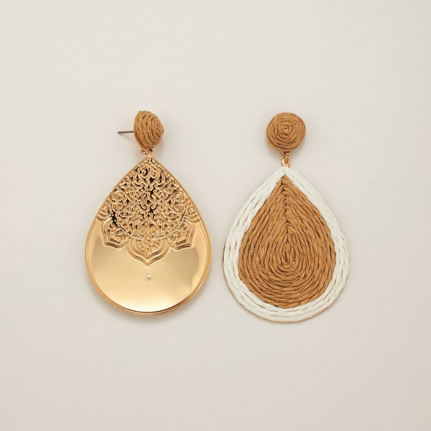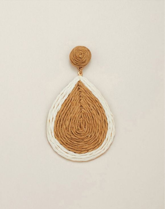 The quintessence of summer chic, these teardrop earrings are made from natural-colored raffia-like drops set in goldtone. Imported.
