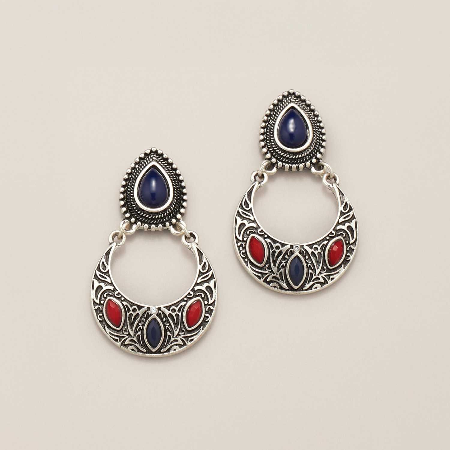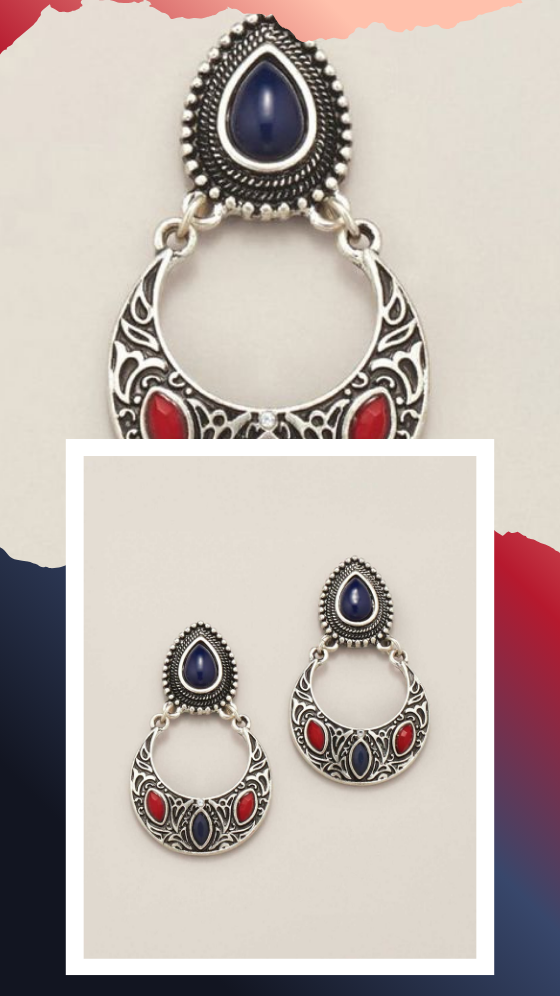 Capture the spirit of the Southwest with a pair of timeless drop earrings. Blue and red jewel-like stones are set in antiqued silvertone with a hammered texture.