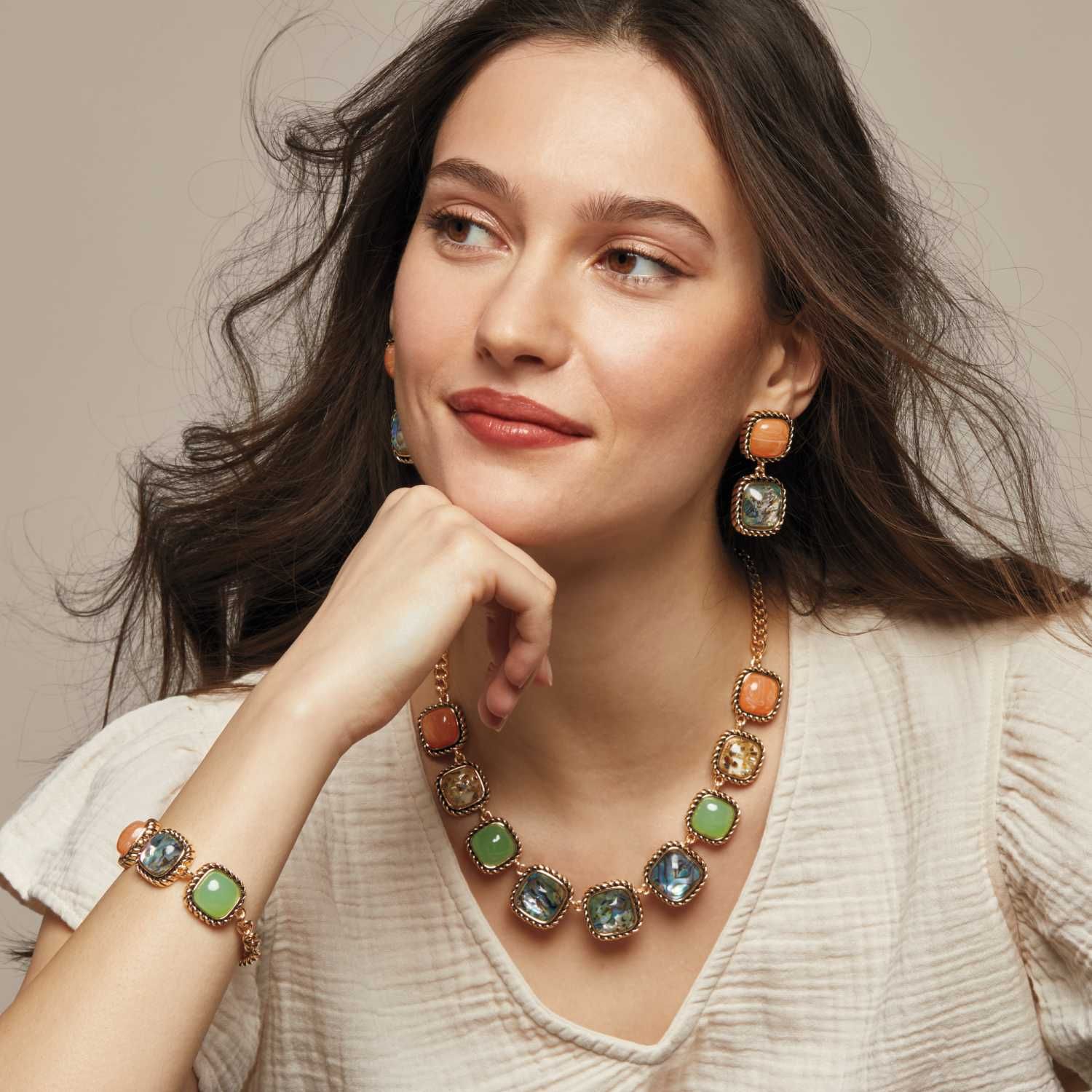 The abalone shell symbolizes protection and prosperity. This statement necklace is comprised of a mix of colored abalone, mother-of-pearl and gem-like stones set in antiqued goldtone. Imported.