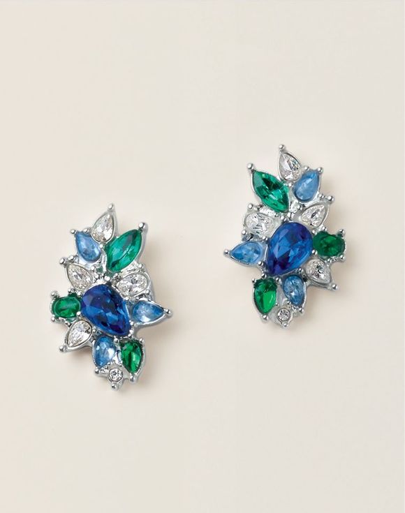 • Floral crystal design with aquamarine, emerald and sapphire-colored glass stones