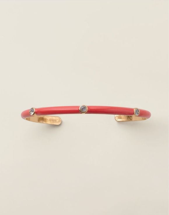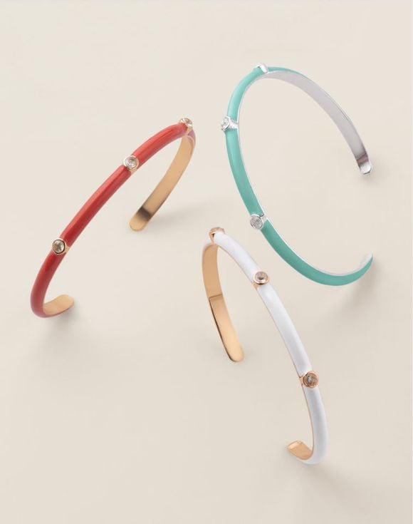 Create a fun style moment with this vibrant trio of stackable cuff bracelets. Set of three bracelets feature mint, white and red colored enamel accented with sparkling CZ stones.
