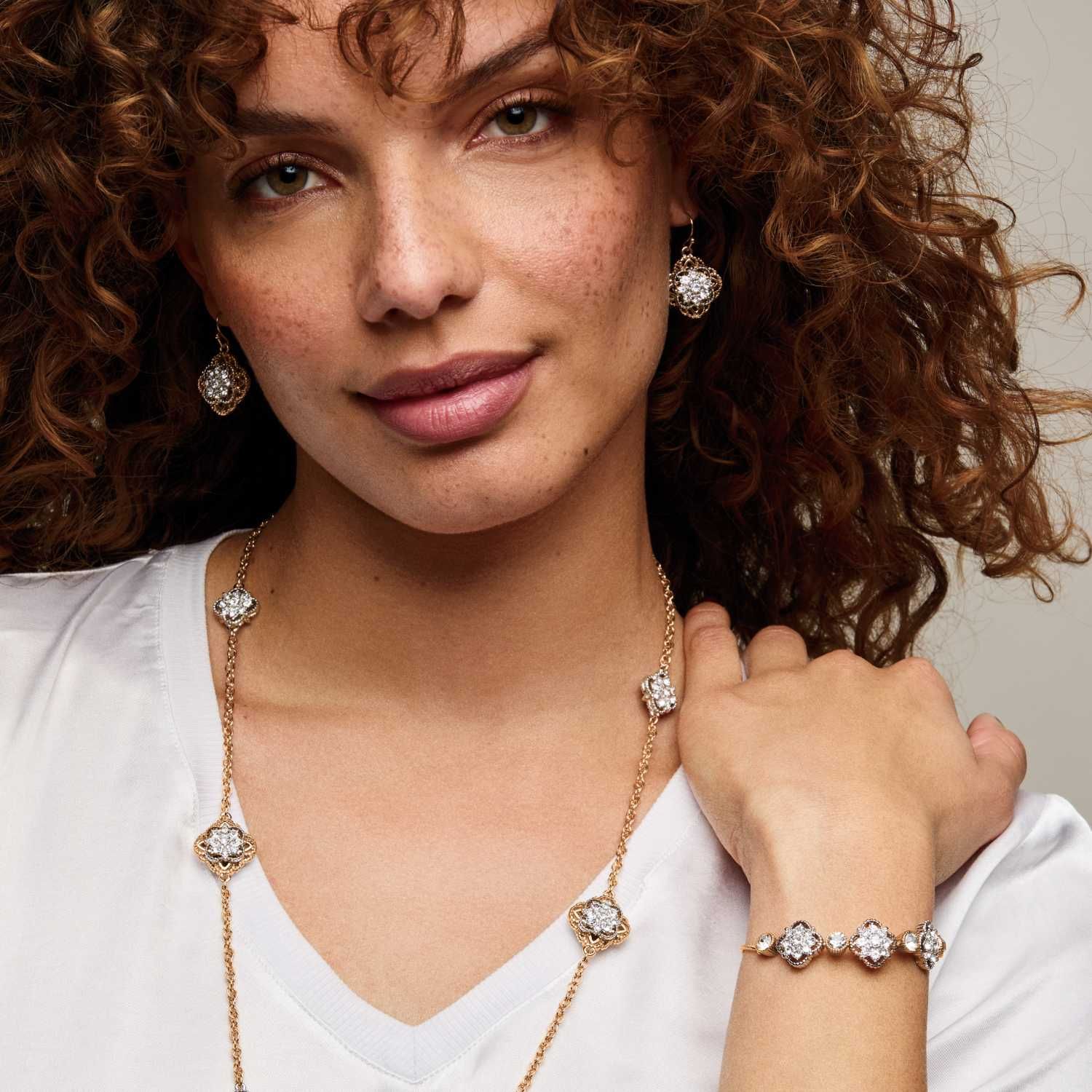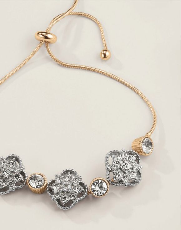 A goldtone pull-cord bracelet adorned with quatrefoil medallions and rounds of clear glass stones set in goldtone adds stunning sparkle to your look. Matching necklace and earring set and hoop earrings also available.