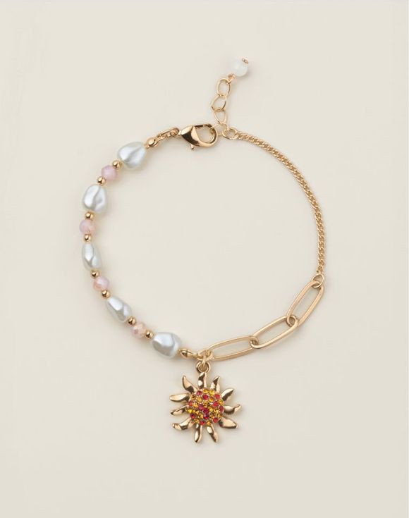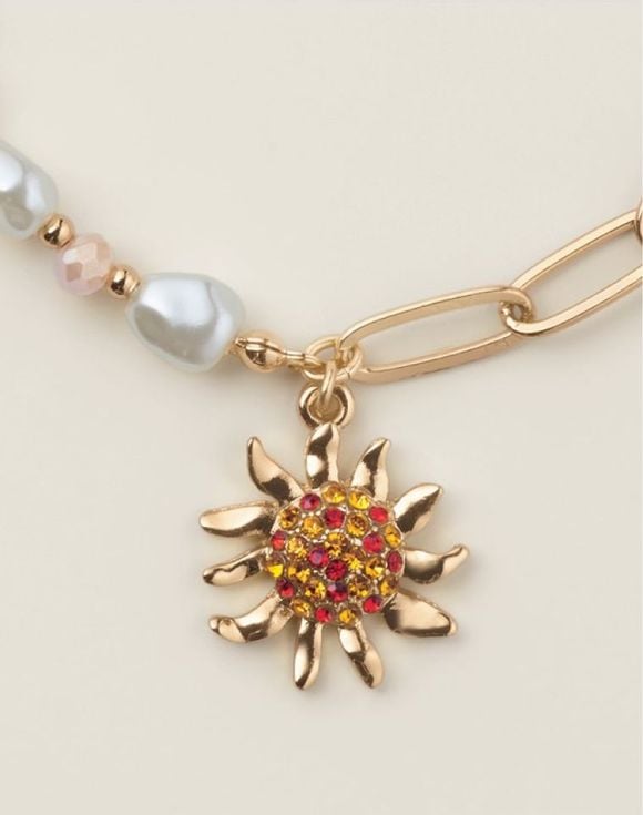 Designed to delight, this radiant bracelet features a graceful mix of pearl-like and soft pink glass beads with a goldtone paperclip style chain, accented with a sparkling sunflower motif that captures the beauty of a sunlit garden. It's the perfect piece to bring a touch of glow and charm to any look.